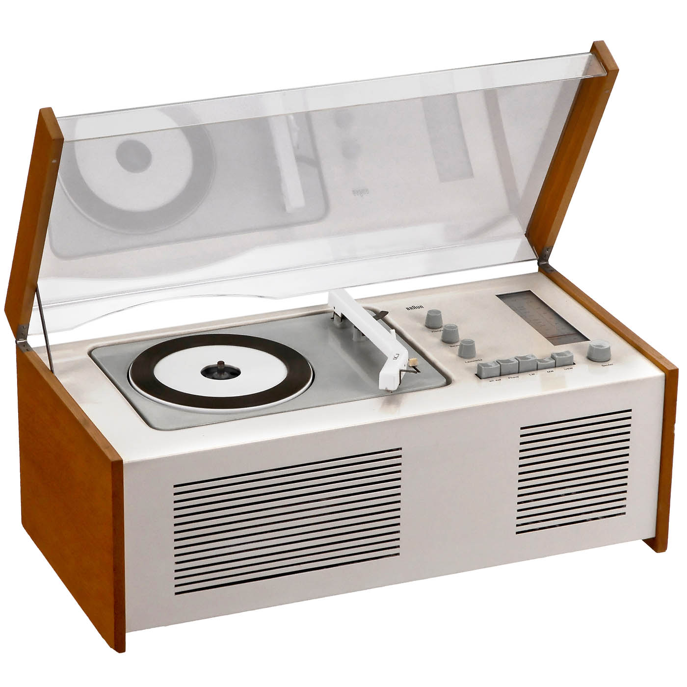Braun, Frankfurt. Radio receiver and record player, 110/220 volts AC, long wave, medium wave and FM, built-in dynamic speaker, record player with four speeds, white-lacquered metal case with ash-veneered wood sides and acrylic cover, good condition, working, potentiometers need cleaning.