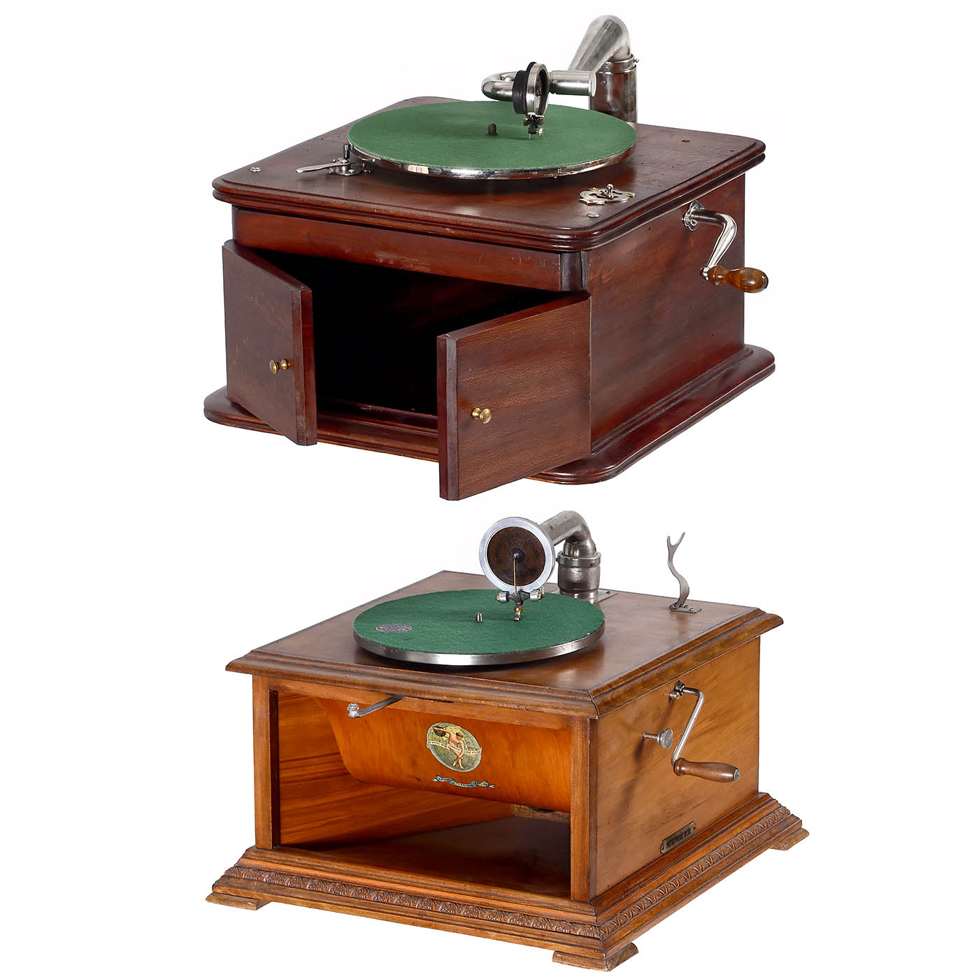 1) Pathéphone No. 30, Paris, c. 1914, for vertically-cut discs, walnut case with carved base, original Pathé reproducer with sapphire needle, horn inside case, with Pathé transfer (discus thrower in front of earth globe), very good working condition. - And: 2) Amphion, table-top unit without lid, horn behind double doors, mahogany-stained wood case, mica soundbox marked "Diaphragme Amphion-Paris - Importé d'Angleterre", very good working condition.