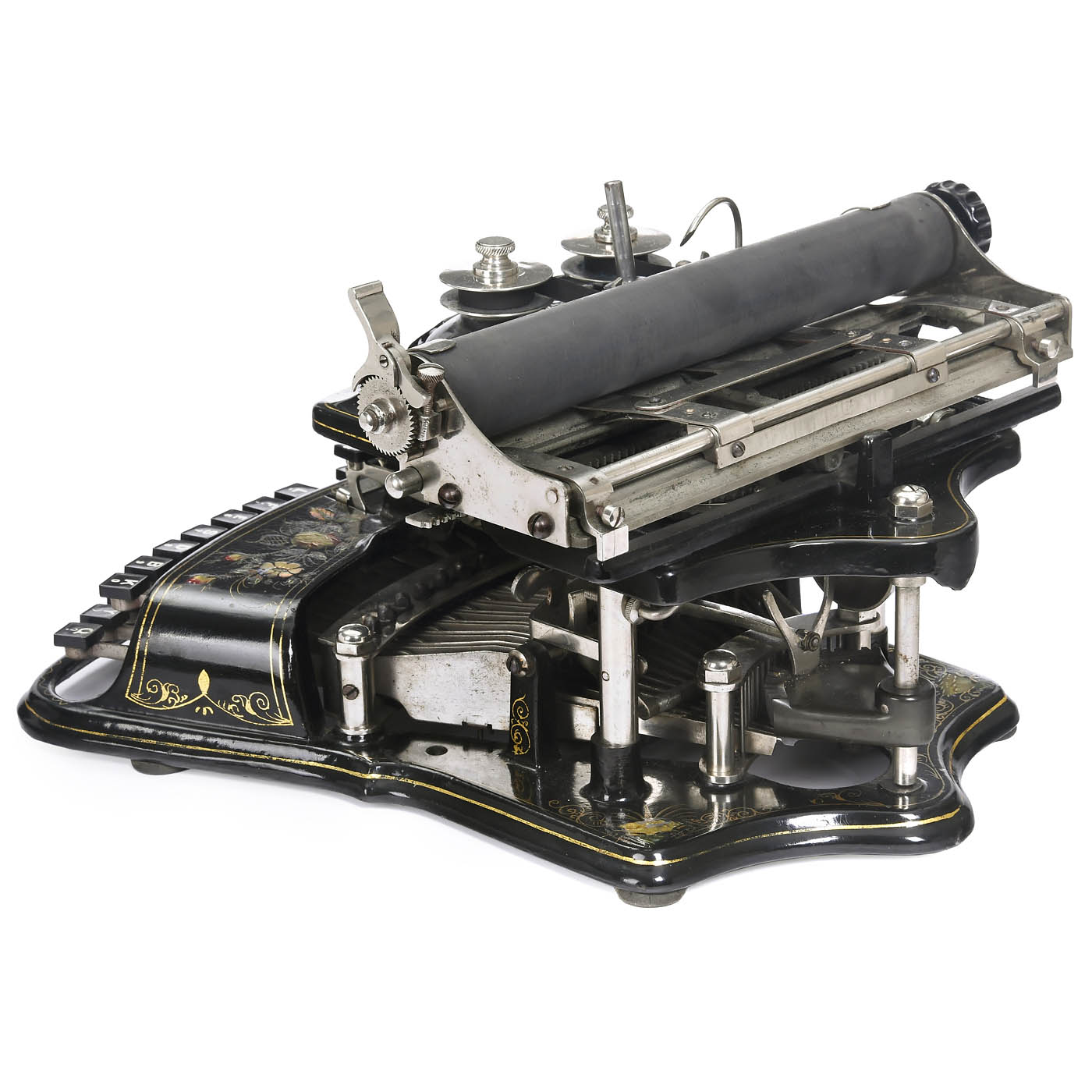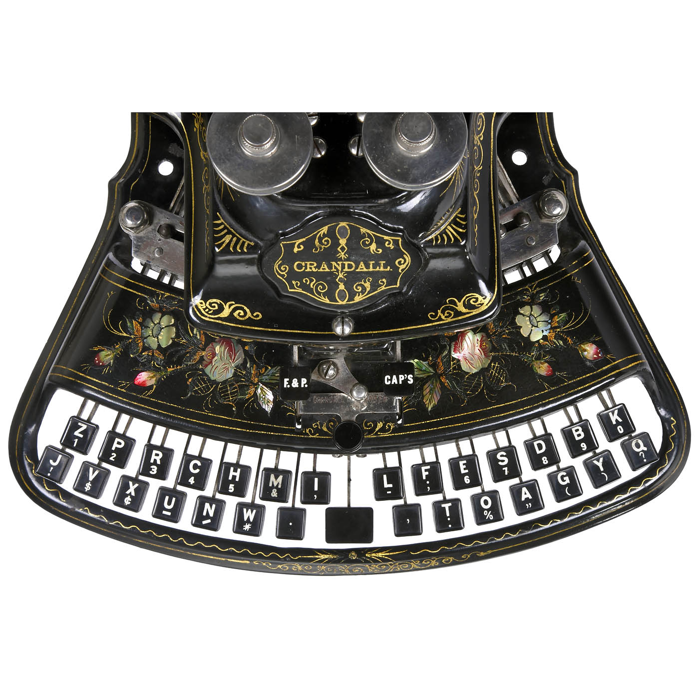 The Crandall Type Writer Co., Syracuse, N.Y. Serial no. 17218, with vertical typesleeve and curved two-row keyboard, one of the most attractive typewriters with its mother-of-pearl and gilt decoration, with case, in excellent original working condition. – A superb pioneer of office communication, collector's item and museum piece.