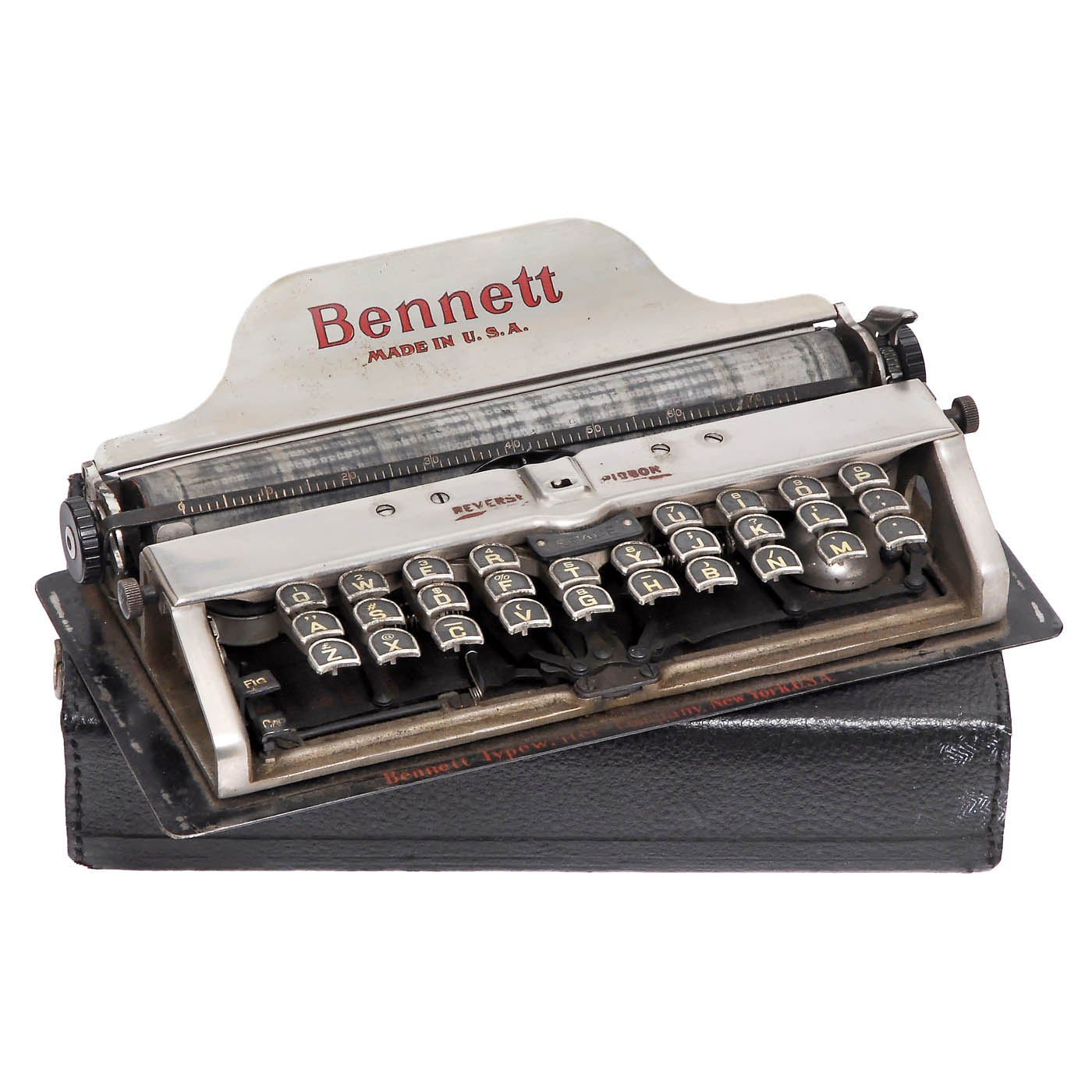 1) Bennett (silver), Bennett Typewriter Company, New York, typewheel, 84 characters, QWERTY keyboard, serial no. 34990, works, with cover. (3/3) – And: 2) American Visible, rare index typewriter by American Visible Co., New York, sloping metal front plate with 46 keys, permanently displayed in the standard keyboard, with nickel-plated device (designed to fit operator's fingertips) that could be moved to select the desired character, and pressed to type that character, incomplete, partially rusty. (4-/4-)
