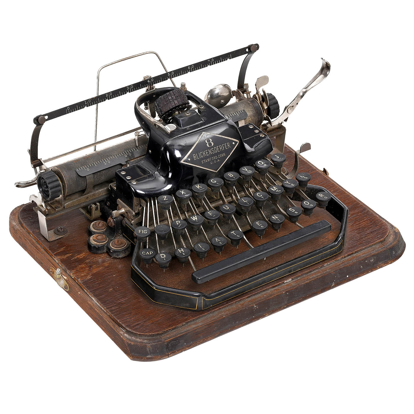American portable typewheel machines, ink-roller, downstroke, 28 keys in 3 rows, 2 shift-keys, 84 characters, invented by George C. Blickensderfer (1850–1917) in 1891 and manufactured by the Blickensderfer Typewriter Co., Stamford, Connecticut. 1) "Blickensderfer No. 5", 1894, serial no. 2878, early version without manufacturer’s plaque, DHIATENSOR keyboard, carriage movement somewhat stiff, typewheel detached (included), with case. (3/4) – 2) "Blickensderfer No. 8", 1910, serial no. 121259, DHIATENSOR keyboard, mechanism stiff, with second typewheel and case. (2–3/4) – And: 3) "Blickensderfer No. 7", 1898 onwards, serial no. 92421, DHIATENSOR keyboard, mechanism sticks, inch-scale missing a screw, in wood case. – Literature: Martin, 1949, p. 136. (3/4)