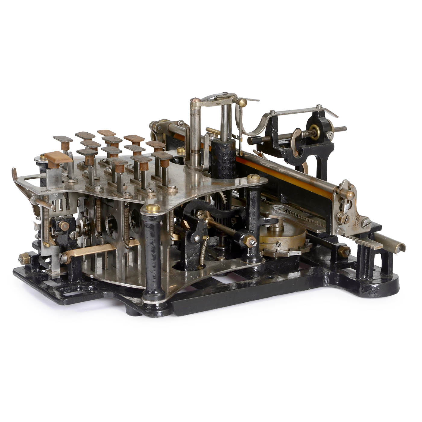 Fuldaer Schreibmaschinenfabrik Carl Lipp. German version of the English type-cylinder machine by John Gardner, Manchester, distributed as "La Victorieuse" in France, equipped with only 14 keys for 84 characters (= 6 per key) – A very complicated writing system! – Literature: Martin, 1949, p. 117. – Partially repainted, missing one keytop, space bar broken, working condition. – An extremely rare collector's item!