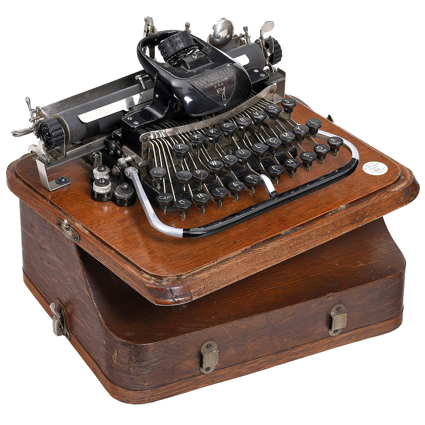 American portable typewheel machines, ink-roller, downstroke, 28 keys in 3 rows, 2 shift-keys, 84 characters, invented by George C. Blickensderfer (1850–1917) in 1891 and manufactured by the Blickensderfer Typewriter Co., Stamford, Connecticut, USA. 1) "Blickensderfer No. 5", 1894, serial no. 3305, early version without nameplate, DHIATENSOR keyboard, carriage movement somewhat stiff, with original case. (3/3) – 2) "Blickensderfer No. 6 Aluminum", 1910, serial no. 146162, QWERTY keyboard, working, with case. (2–3/2–3) – And: 3) "Blickensderfer No. 7", 1898 onwards, serial no. 135388, DHIATENSOR keyboard, working, in wood case. – Literature: Martin, 1949, p. 136. (2/2)