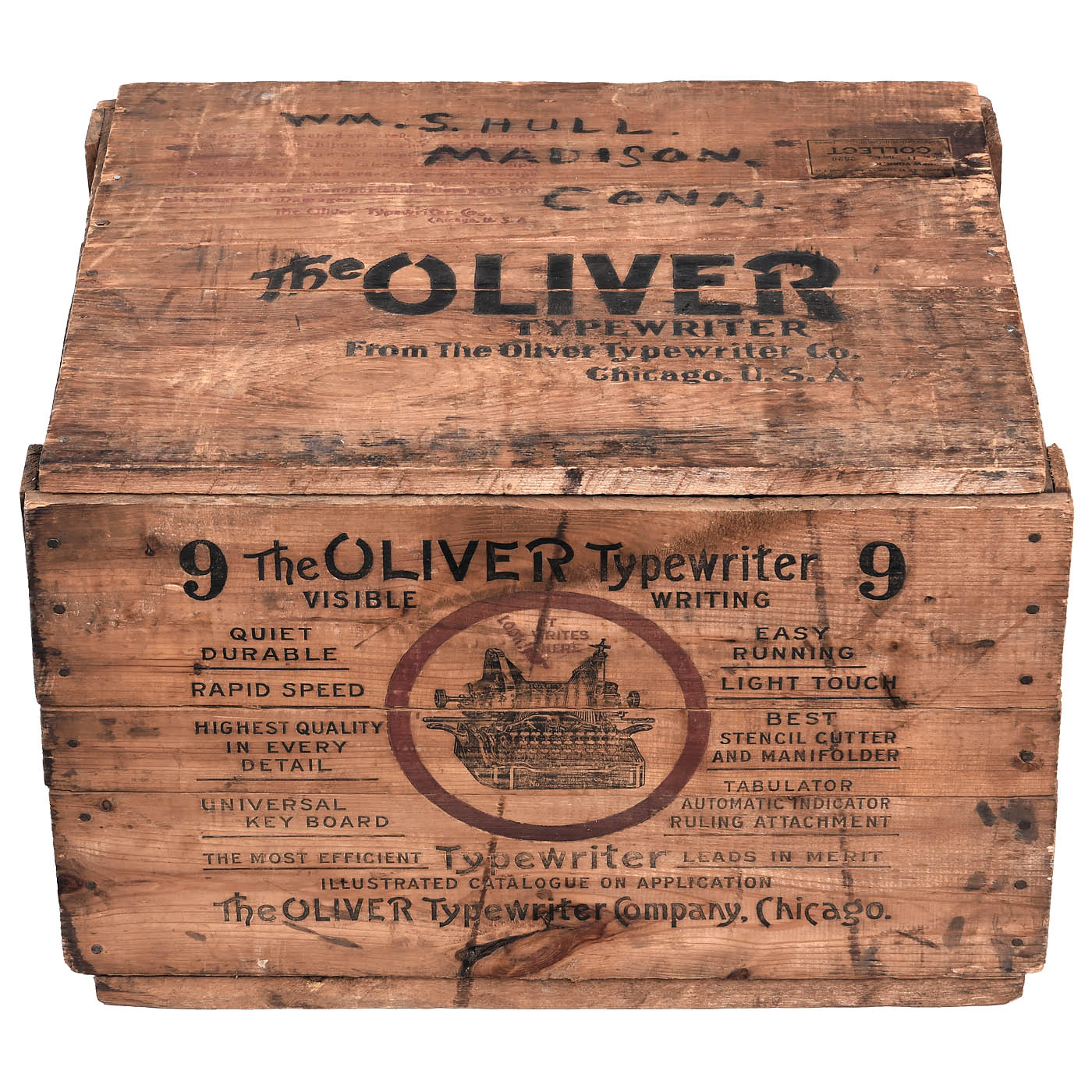 1) "The Oliver Standard Visible Writer No. 9", serial no. 753630, Chicago, downstroke machine with 2 towers of typebars, somewhat resinous, otherwise in good condition. – Literature: Martin, 1949, p. 153. – With rare wood shipping crate, 2 embossed sides and several stickers.