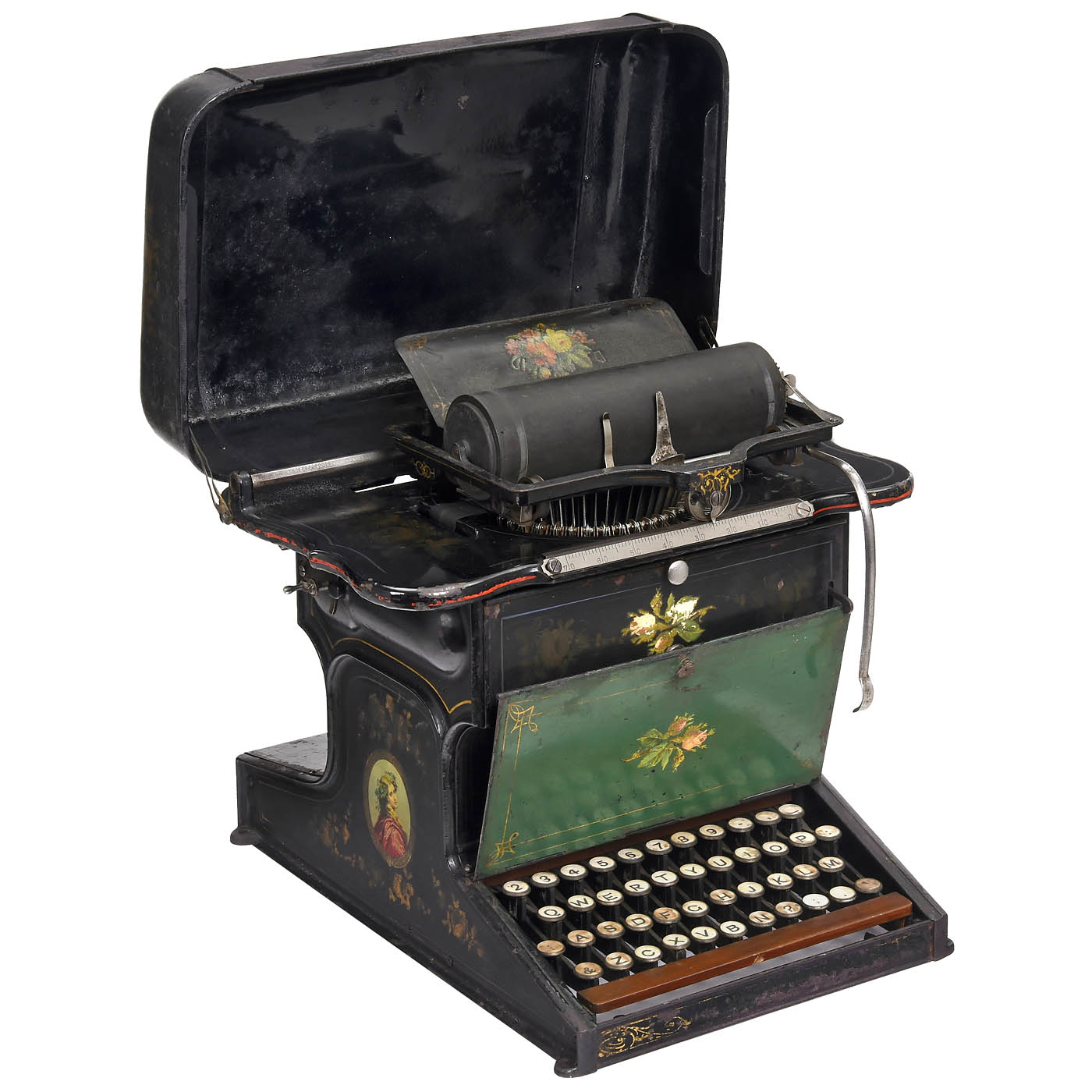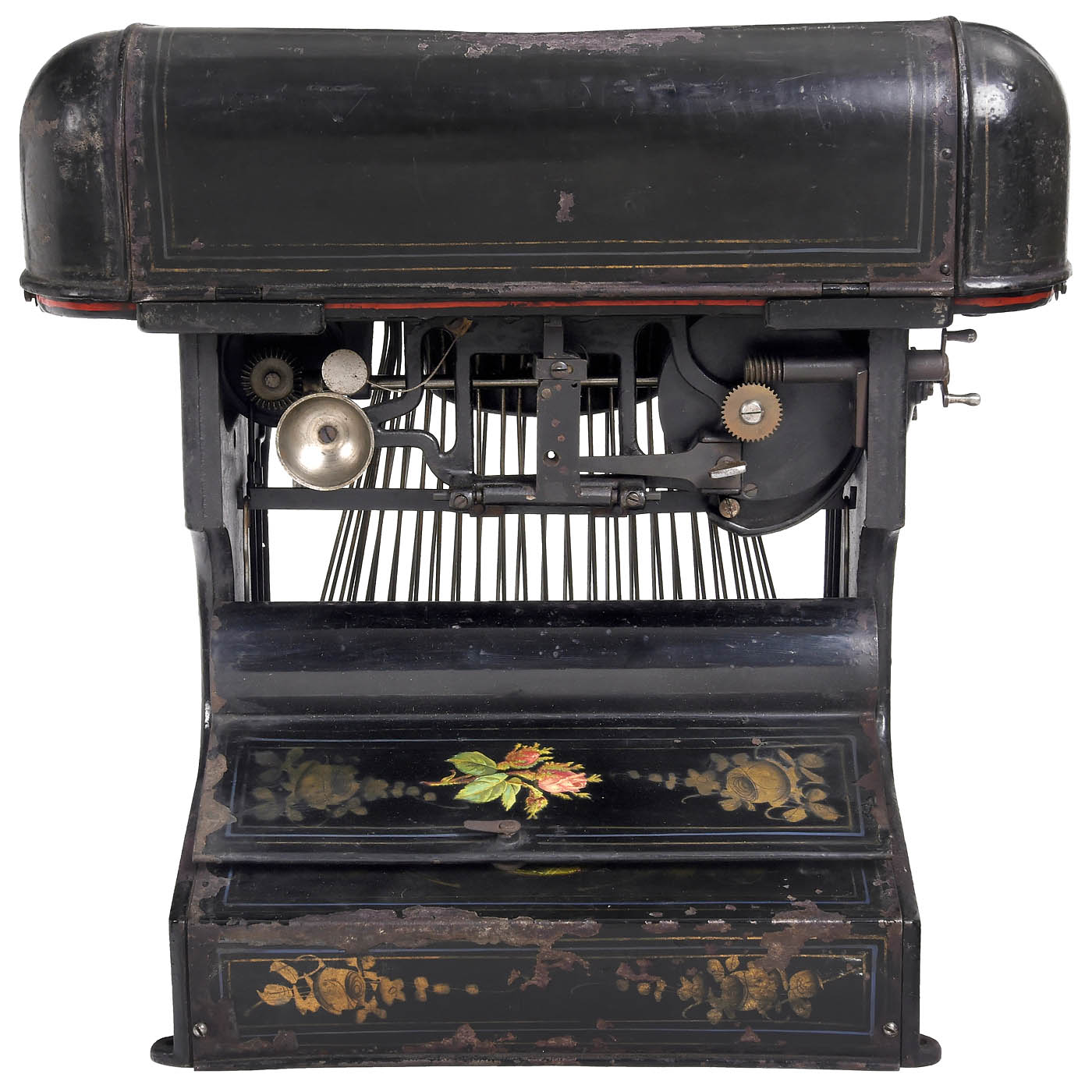 Remington & Sons, Ilion, New York. Serial no. A974, with detailed painted floral decoration and top carriage-return lever, capital keys (no lower case), glass keytops and wood key levers, with lid, carriage escapement in need of repair. – Note: The Sholes & Glidden was the first commercially successful typewriter, a milestone in the history of office equipment. – Literature: Martin, 1949, p. 61. – A giant rarity and a highlight in any collection!