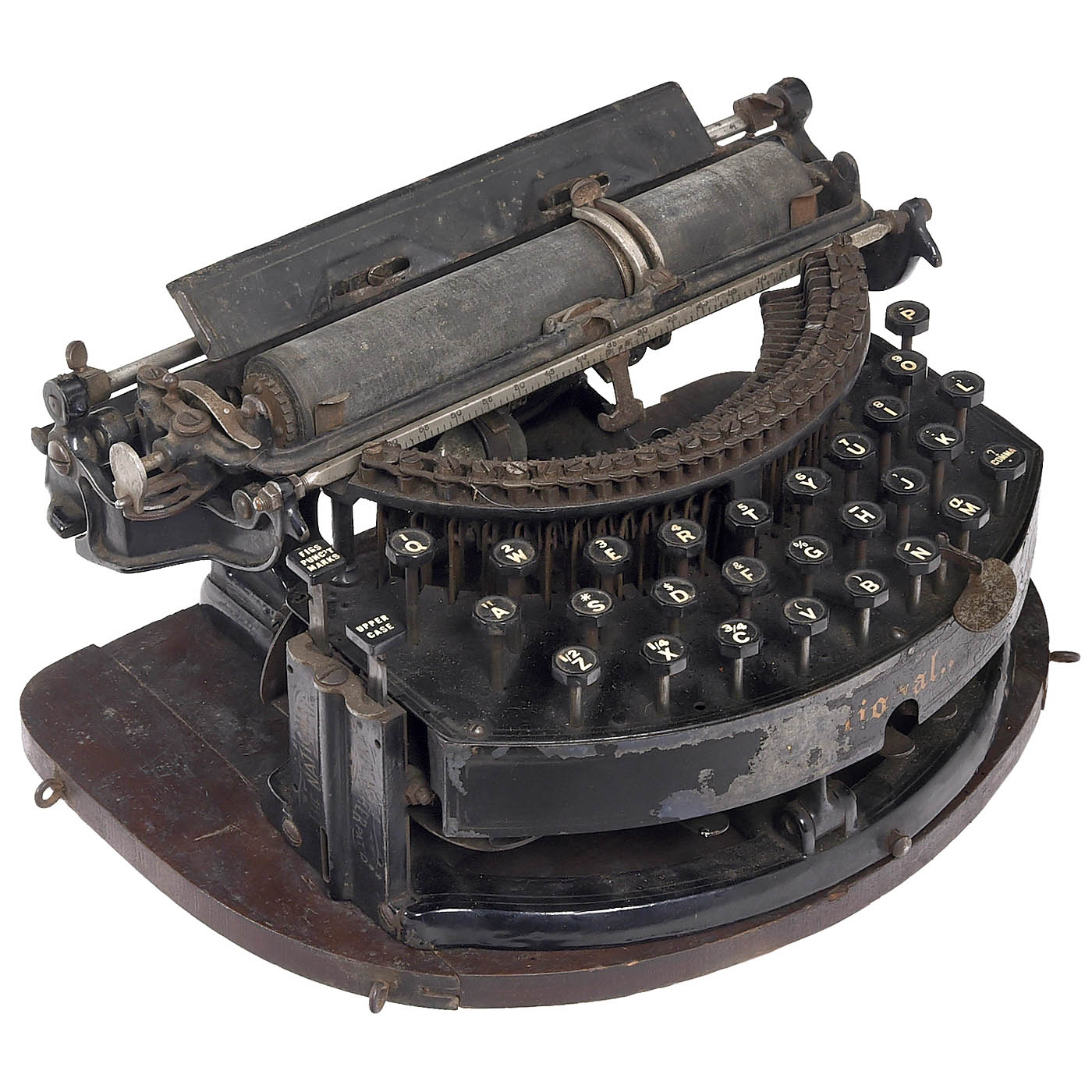 1) "National 1A", 1889, low serial no. 1424, rare American upstroke machine by Hermann Unz from the idea and patents by Franz Xaver Wagner, New York City, with round Ideal keyboard, frame at the rear broken, loose carriage enclosed. – One of the great typewriter inventions! – And: 2) "Williams No. 4", c. 1900, attractive American "Grasshopper" typewriter, serial no. 21611, missing parts, loose carriage enclosed. – Literature: Martin, 1949, p. 128. – Both in need of restoration.