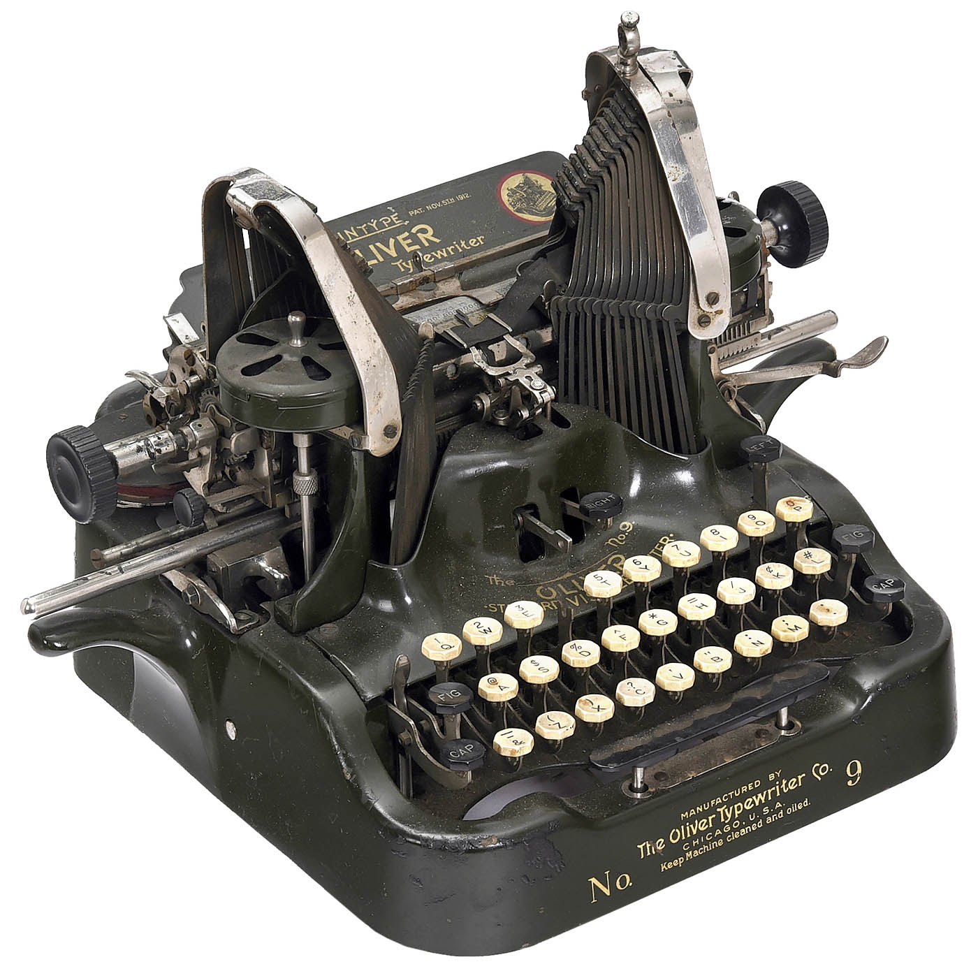 1) "Remington Standard No. 2", 1890, serial no. 91171, American upstroke machine, partially rusty, three typebars broken, carriage movement defective. Successor to the famous Sholes & Glidden, the first successful typewriter in the world. (4/4) – 2) "Underwood Standard No. 5", c. 1920, no. 2496342-5, four-row frontstroke, 84 characters, somewhat dirty and rusty, mechanism stiff. (3–4/3–4) – 3) "Smith Premier No. 2", 1895, serial no. 113175, second model of this popular American upstroke machine with full keyboard and in-built cleaning brush, working. – Literature: Martin, 1949, p. 109. (2–3/2–3) – And: 4) "Oliver No. 9", c. 1919, serial no. 774641, defective, incomplete. (5/5)