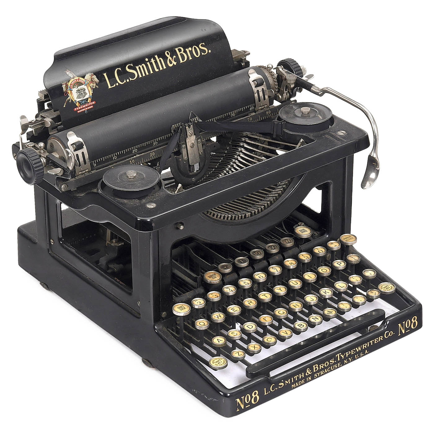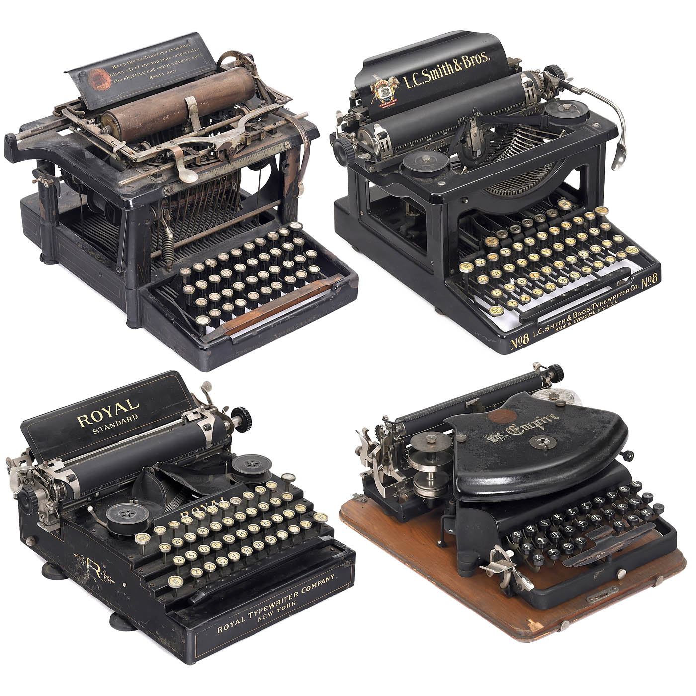 1) "The Empire No. 1", c. 1902, serial no. 33212, Williams Manufacturing Company, Montreal, Canada, thrust-action double-shift typewriter, 28 keys, working, in need of cleaning, with cover and wood base. (3–4/3) – 2) "L.C. Smith No. 8", c. 1918, with tabulator, working. (2–3/2–3) – 3) "Royal Standard No. 1", 1907, serial no. 2404, 4-row flatbed typewriter, somewhat dusty, working. (3-/2–3) – And: 4) "Remington Standard No. 2", 1890, serial no. 96922, American upstroke machine, partially rusty, carriage movement defective, with tin cover. Successor to the famous Sholes & Glidden, the first successful typewriter. (4-/4-)