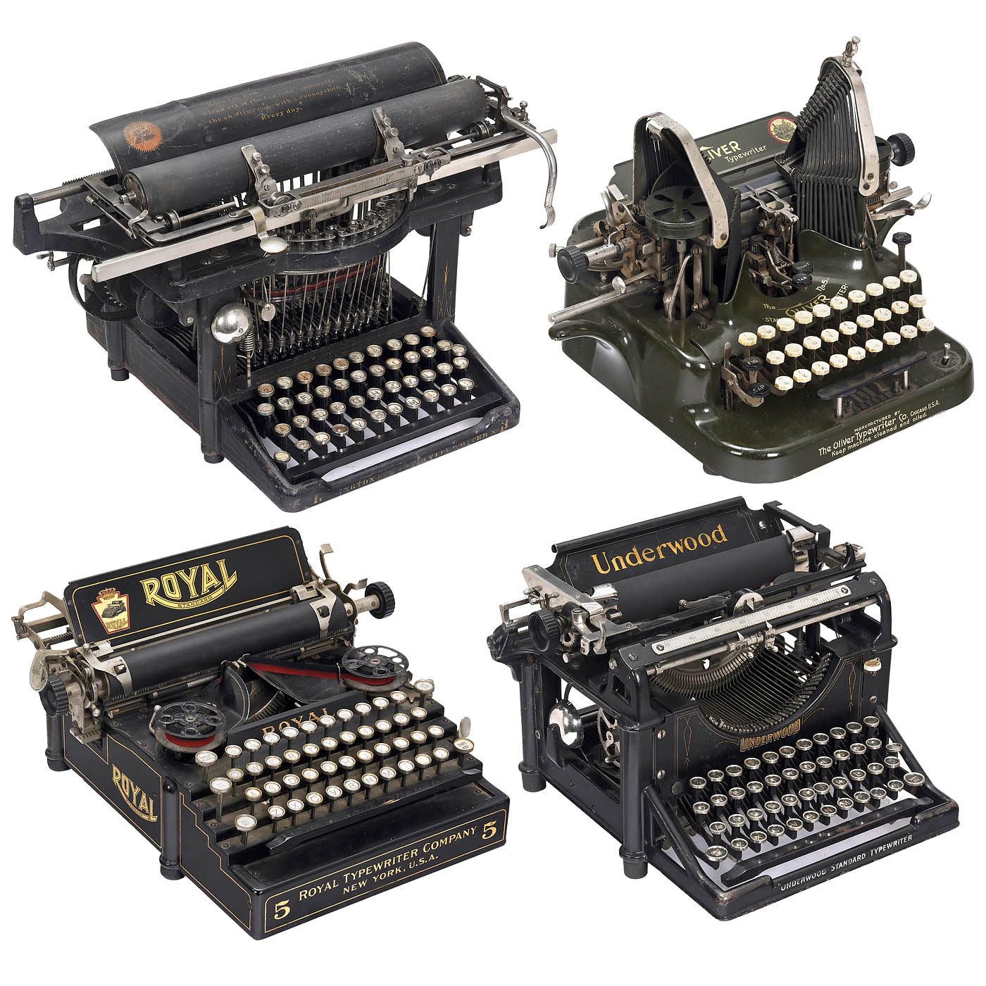 1) "Remington Standard No. 3", c. 1879, serial no. 3646, extra-wide carriage, upstroke machine, wood typebars, carriage movement defective. – Literature: Martin, 1949, p. 67. – A very rare model. (3/4) – 2) "Royal Standard No. 5", c. 1910 onwards, serial no. 100459-5, Royal Typewriter Co., New York, four-row frontstroke machine, working, mechanism somewhat stiff, in need of cleaning. (2–3/3) – 3) "Underwood Standard No. 2", c. 1902, no. 13606-2, four-row frontstroke machine, mechanism clumsily repaired, carriage defective. (3/4) – And: 4) "Oliver No. 5", 1912, serial no. 268429, popular American frontstroke machine, working. (3+/3+)
