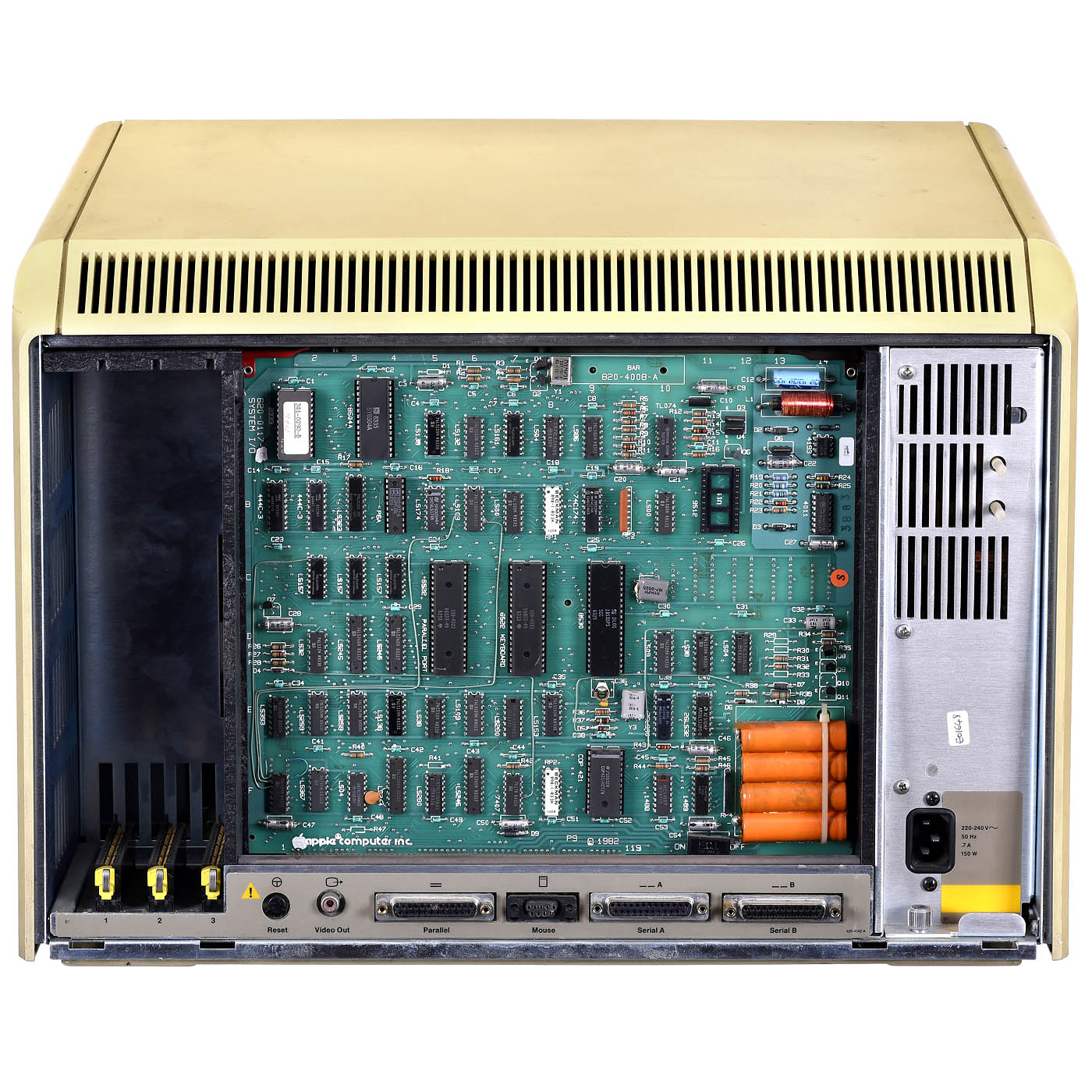 Apple Lisa 1, converted by Apple to Lisa 2/5, model no. A6SB100P, serial no. B08B831320172, Applenet no. 00103089, manufactured: 83132, with first version of the main board, 4 nickel-cadmium batteries (should be replaced), Motorola 68000 CPU and Apple ProFile hard disc model no. A0M1005. – Both for Europe, 230 volts AC. – Note: Lisa 1 was first personal computer with GUI (graphical user interface) by Apple and the predecessor of the Apple Macintosh. When the original Twiggy floppy drive proved unreliable, Apple offered all Lisa 1 owners a free upgrade to the Lisa 2: the front panel and the Twiggy-drives had to be sent back to Apple and the Lisa became the first computer fitted with a modern Sony 3.5-inch floppy disk drive. The Lisa computer was, therefore, very reliable and could even process various operating systems.