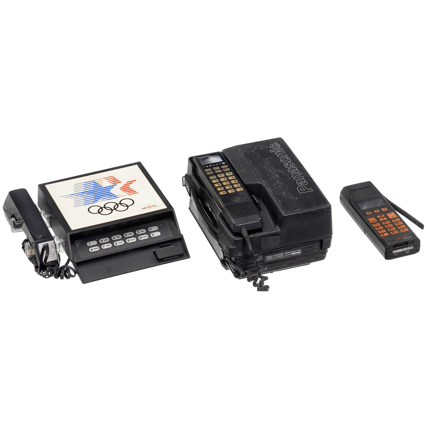 1) PTT Trub, Switzerland, case and receiver made of wood. – 2) Fältprovstelefon DiaMark, Sweden. – 3) Ericsson DBK 21X14, Sweden, bakelite, with dial. – 4) Telegrafverket O.T.A. Type 1.11., Sweden, beige plastic, with dial. – 5) Doro Shadow, Sweden, transparent cradle. – 6) Grillo Proprieta' Sip, Italy, foldable. – 7) Telegrafverket A002, Sweden, wall model. – 8) L.M. Ericsson, Sweden, red case, with dial. – 9) ATC Genie Phone, USA, donut-shaped. – 10) Telegrafverket, Sweden, bakelite, with crank, switches, dial and external bell box. – 11) Western Electric, USA, with dial. – 12) Televerkstaden, Sweden, unusually arranged keypad. – 13) The Trimline Phone, Western Electric, USA. – 14) Teli, Sweden, Tillhör Televerket, case made of certified African rosewood. – 15) ITT Own-a-Phone, Mexico, multi-colored plastic case, with dial. – 16) Eola Liptovsky Hradok, Slovakia, with dial. – 17) S.A. Fabbr. Naz. Appar. Telefonici, Italy, with dial. – 18) Kellogg Switchboard & Supply Company, USA, sky blue metal case, with dial. – 19) Telegrafverket, Sweden, with dial. – 20) Pactel 1984 Olympics Telephone, Japan/USA, keypad behind flap. – 21) Contempra, Northern Electra Company, Canada, dial in handset. – 22) Radiovox II, Sweden, radio telephone. – And: 23) 12 more telephones. – In addition: An early Panasonic mobile phone and 18 other mobile phones, including 3 iPhones.