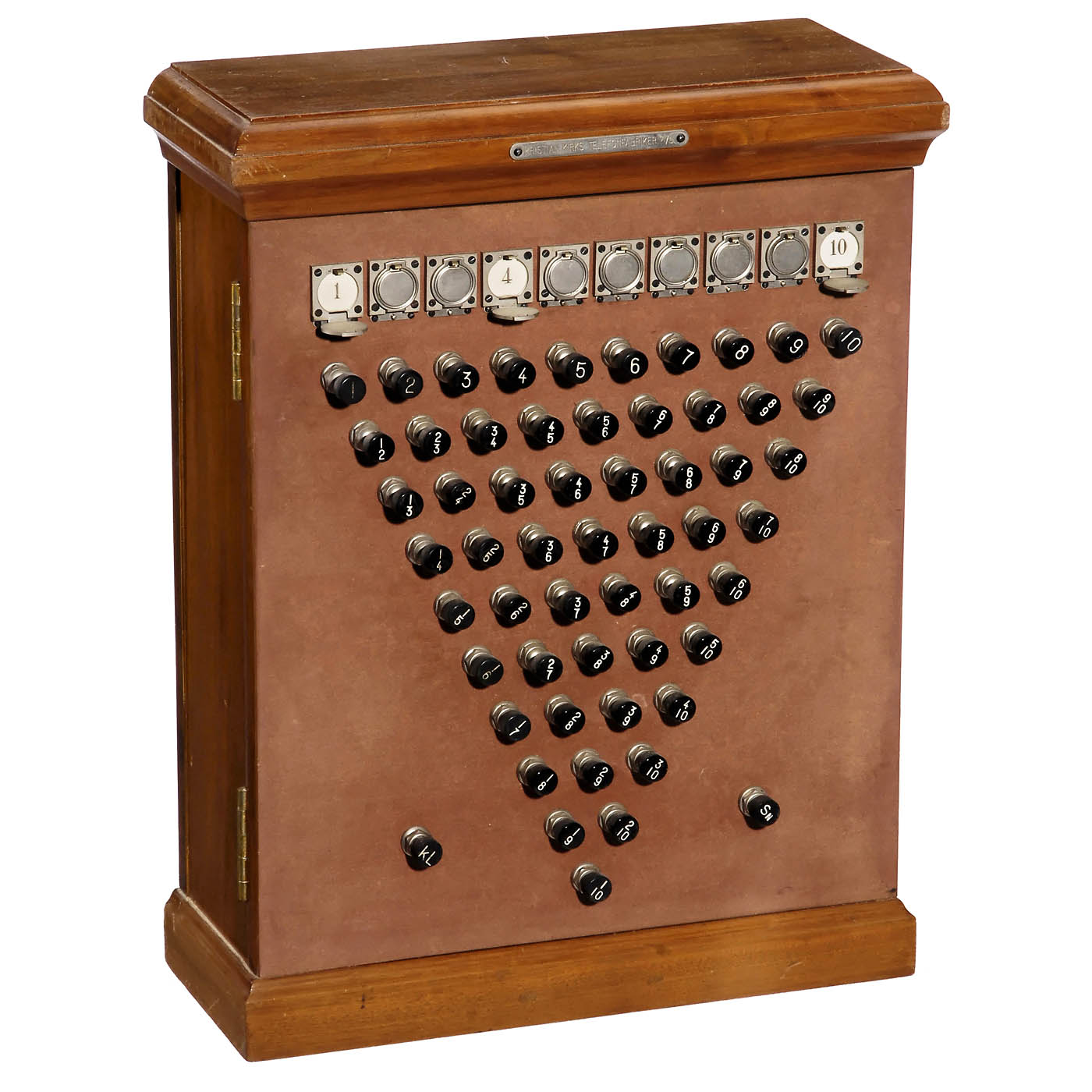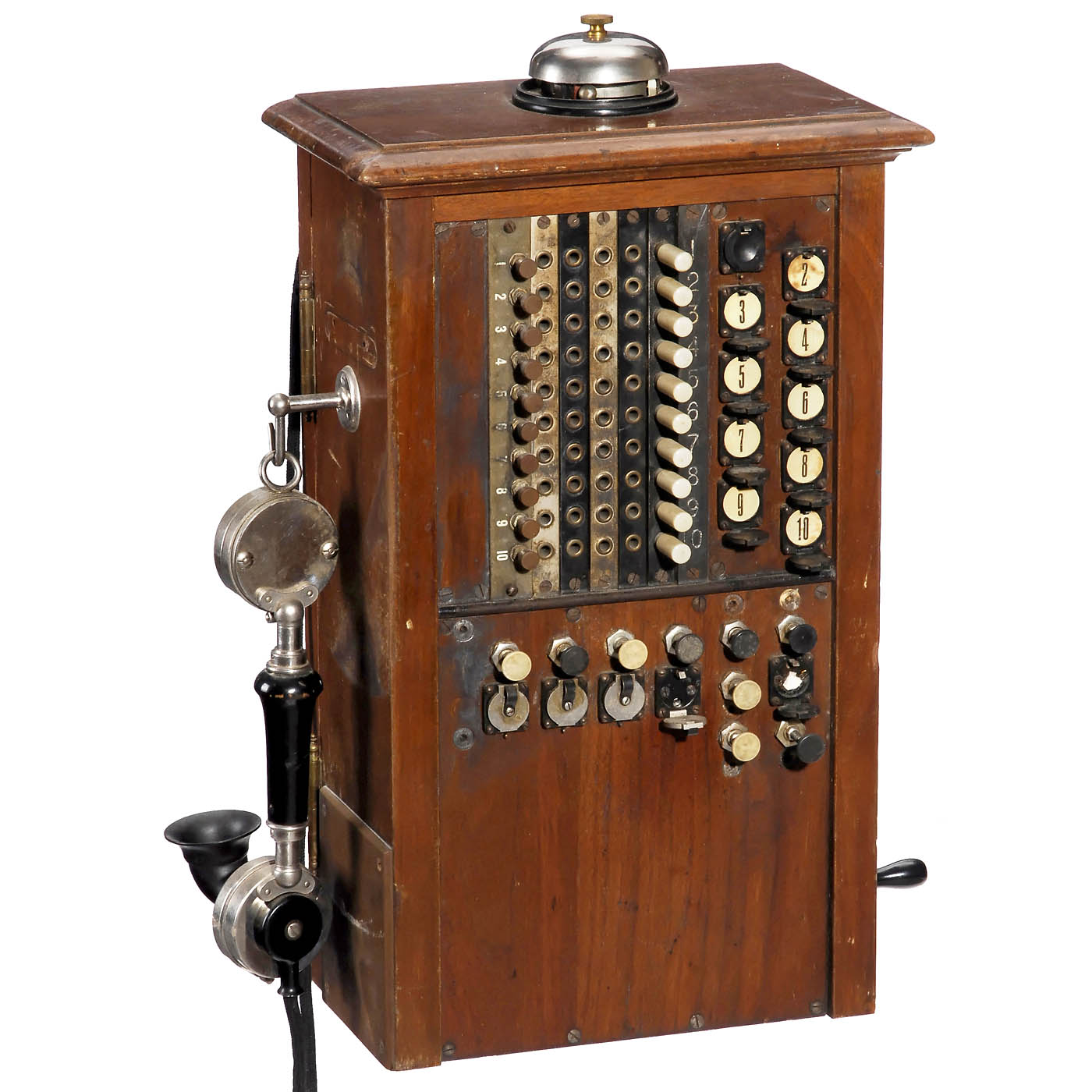 1) Unmarked, probably Sweden, walnut case, 15 keys, 10 switches, 10 plugs, crank-inductor, bell with night switch, handset with speaking horn, some internal parts loose, height 20 in. – And: 2) Kristian Kirks Telefonfabriker, Horsens, Denmark. Light oak case, 10 keys, 57 switches, height 18 ½ in.