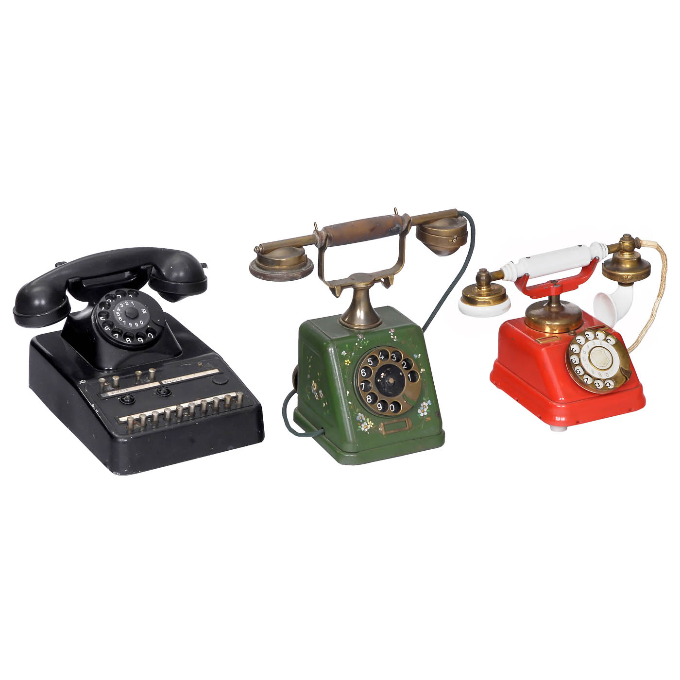 1) Swedish Televerket coin-operated telephone, green metal case, dial, bakelite receiver. – 2) Wall telephone, L.M. Ericsson, bakelite case and receiver, crank inductor, double bell. – 3) 2 FTR table telephones, Bell Telephone, Belgium, metal case, bakelite receiver, dial. – 4) Intercom telephone, probably England, bakelite receiver, metal case. – 5) Company telephone, Germany, for 10 connections, with dial. – 6) Wall-mounted telephone, Western Electric, USA, metal case, speaking horn, Bell-type bakelite receiver, wiring not complete. – 7) Desk telephone, Siemens & Halske, green-lacquered metal case with floral motifs, dial, double bell, handset with hygienic microphone. – 8) Desk telephone, RTT 56, Belgium, copper case, dial, bakelite receiver. – 9) Desk telephone, Kjøbenhavns Telefon Aktieselskab, red metal case, dial, counter, handset with speaking-in horn. – 10) Desk telephone, PTT, copper case, bakelite receiver, dial, 7 switches. – 11) Desk telephone, Siemens & Halske, bakelite, with dial. – And: 12) Wall telephone, Siemens & Halske, unusual line dialer, dialing with rotary switch, metal case, bakelite receiver, rare.