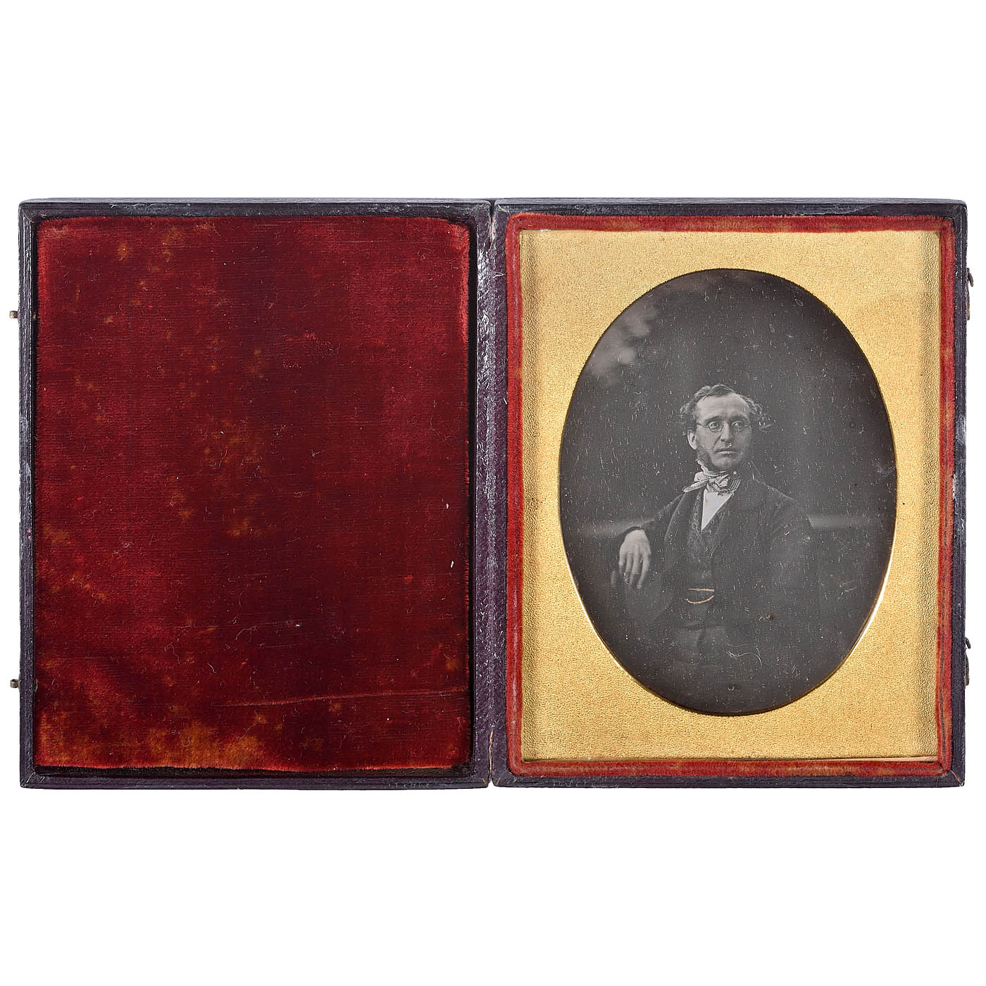 1) Daguerreotype of an intellectual gentleman with whiskers and gold-tinted watch chain, in 3 ½ x 4 ¾ in. dark-red leather case, resealed. – And: 2) Ambrotype of a lady in a gig ready to go out, surrounded by people in front of her property, in 4 x 4 ¾ in. dark-red leather case with a gilt clasp. – Two charming images.