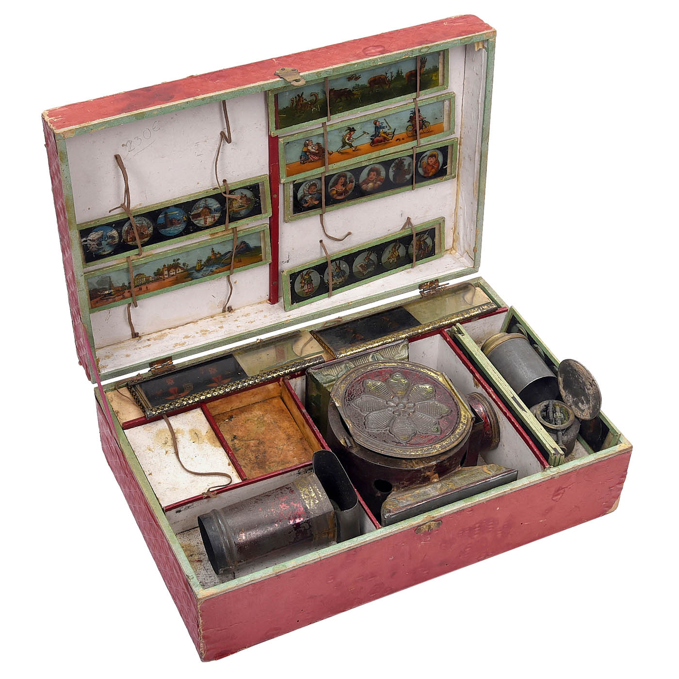 Lapierre, Paris, Lantern Salon 11B, for 43 mm wd. slides, with chimney, optic, burner and slide-in mirror, 10 original and 2 animated slides, in original decorative red case with gilt legend: "Lanterne Magique", wire hook missing on the side hinge. – In addition: A chromatrope, a slide of 6 cm wd. and 20 slides of 3 cm wd.