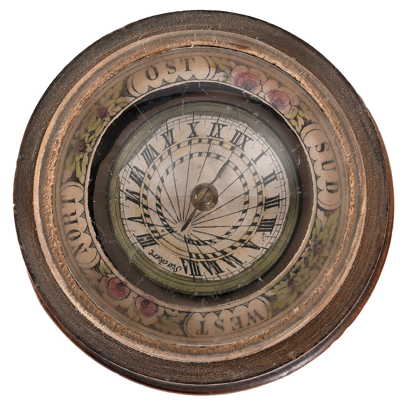 Johann Paul Stockert, Nuremberg. Pantochronometer with floating circular printed paper dial and gnomon, floral-lithographed and hand-colored compass ring with Roman numerals, automatically adjusting to the north-south line, printed credit "Stockert" at south, under domed glass cover, in turned fruitwood case with lid, Ø 2 ¼ in., small chip at the lower edge, working.