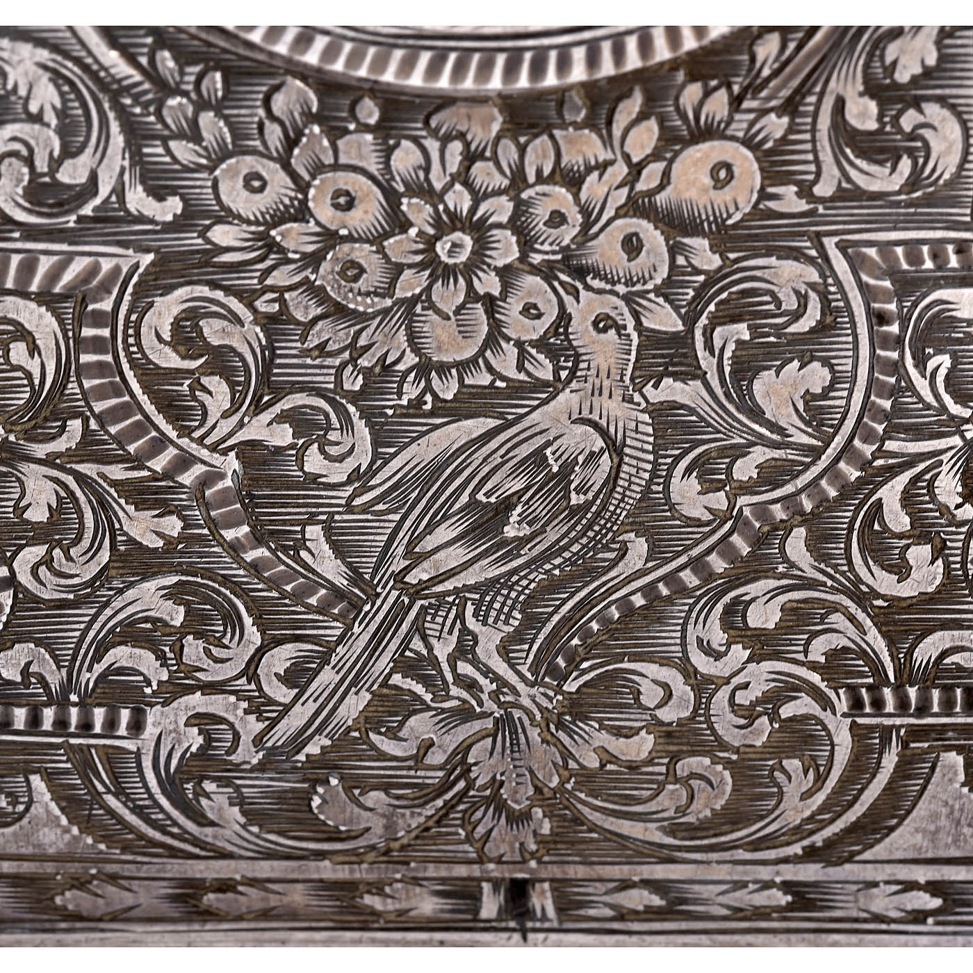 Book-form silver case with four bound-in rectangular tablets for the notes, the front engraved with fine Rocaille motifs, flowers and two birds, the center set with a revolving disc calendar for day and date (of the month), the back with a list of the months, the most important festivals, engraved drawings of the signs of the zodiac, the length of day and night and the rising and setting of the sun, pen added, 2 ½ x 4 ¼ in.