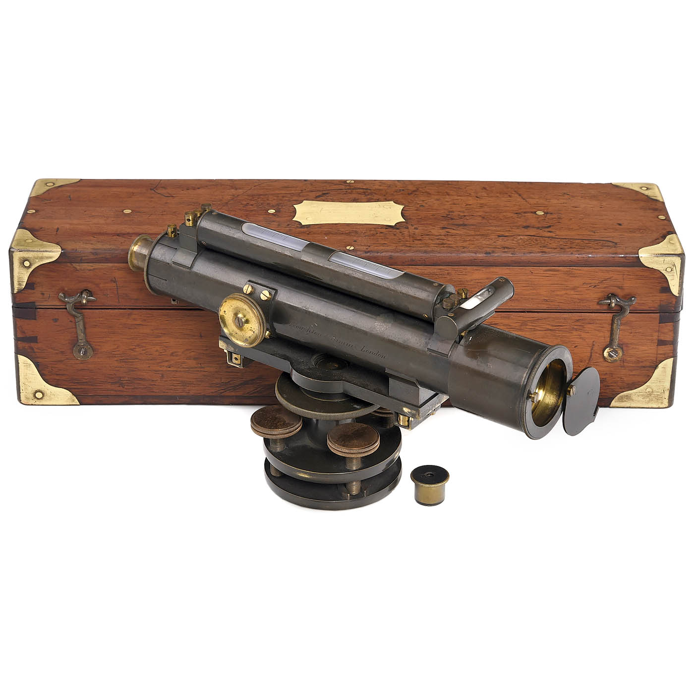 Signed "Troughton & Simms, London", serial no. 1/4132 (inside the case), original lacquered and oxidized brass, with 2 spirit levels, length of the telescope 11 ¾ in., with a second eyepiece and tripod in fitted mahogany case. – A precision instrument in very good original condition!
