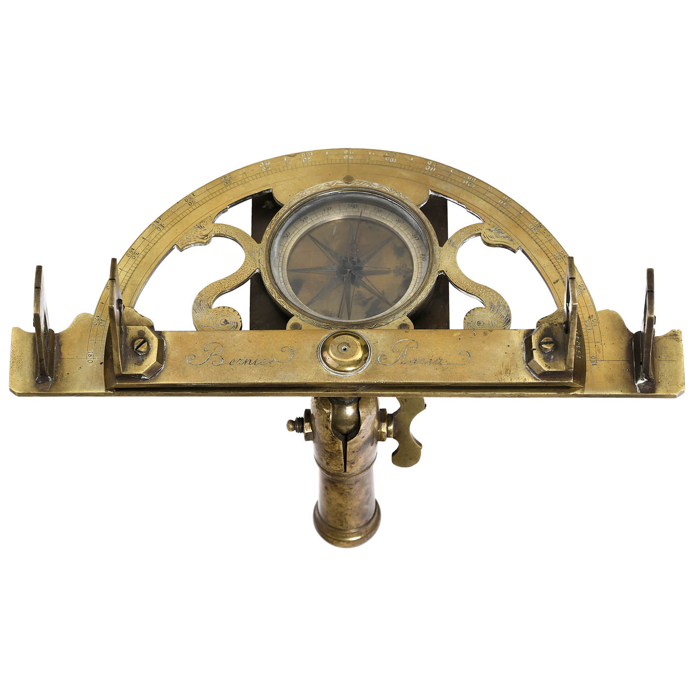 Signed "Bernier, Paris", brass, the protractor arch with engraved scales and 4 sighting vanes, silvered compass scale, Ø 2 1/8 in., instrument diameter 9 1/4 in., on ball-joint socket for a Jacob's staff.
