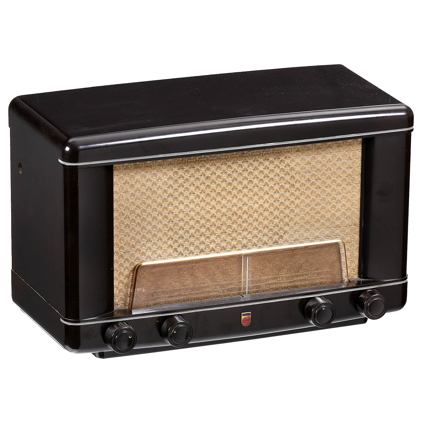 1) ORA S537, Oradyne, Gérard & Cie, Paris, c. 1935, 5 tubes, 3 wavebands, 110–240 volts AC, dynamic loudspeaker, complete with tubes and rear panel. – 2) Loisirs 461A, Philips, France, c. 1937, 5 tubes, 3 wavebands, 103–253 volts AC, dynamic loudspeaker, with tubes, without rear panel. – 3) Philips, France, c. 1950, complete with tubes and rear panel. – 4) Philips BX370U, Netherlands, 1948, 5 tubes, 3 wavebands, universal current, dynamic loudspeaker, complete with tubes and rear panel. – 5) Telefunken 300, Radiotechna, Prague, 1933, 4 tubes, long wave and medium wave, 110–240 volts AC, dynamic loudspeaker, with tubes, without back panel. – 6) Philips 215HU, Netherlands, 1939, 4 tubes, 3 wavebands, all currents, dynamic loudspeaker, complete with tubes and rear panel. – 7) Philips 470A, France, 1938, 4 tubes, 3 wavebands, alternating current, dynamic loudspeaker, complete with tubes and rear panel. – And: 8) Europaklasse EK, Radio H. Mende & Co. GmbH, Dresden, 1933, 3 tubes, 3 wavebands, 110–240 volts alternating current, dynamic loudspeaker, complete with tubes and rear panel.