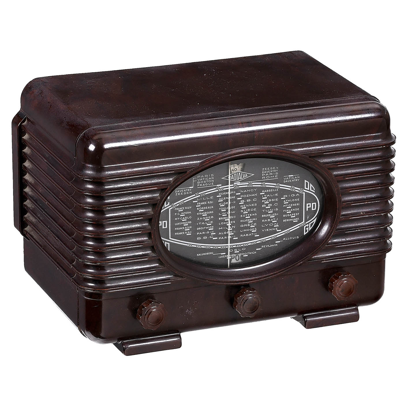 1) Philips 940A, 1935, Netherlands, 3 tubes, long wave and medium wave, 110–240 volts AC, dynamic loudspeaker, complete with tubes and rear panel. – 2) Bush TAC. 90A, c. 1955, Bush Radio, London, 5 tubes, long wave and medium wave, all-current, dynamic loudspeaker, complete with tubes and rear panel. – 3) Excellence 200, c. 1945, Sonora Radio, Paris, 4 tubes, 3 wavebands, 110–260 volts AC, dynamic loudspeaker, with tubes, rear panel replaced. – 4) Philips BX310U, c. 1952, Belgium, 5 tubes, 3 wavebands, all-current, dynamic speaker, complete with tubes and rear panel. – 5) Bush DAC 10, c. 1952, Bush Radio, London, 5 tubes, long wave and medium wave, all-current, dynamic speaker, complete with tubes and bakelite rear panel. – And: 6) Super-Groom, c. 1940, Radialva, Paris, 5 tubes, 3 wavebands, all-current, dynamic loudspeaker, complete with tubes and rear panel.