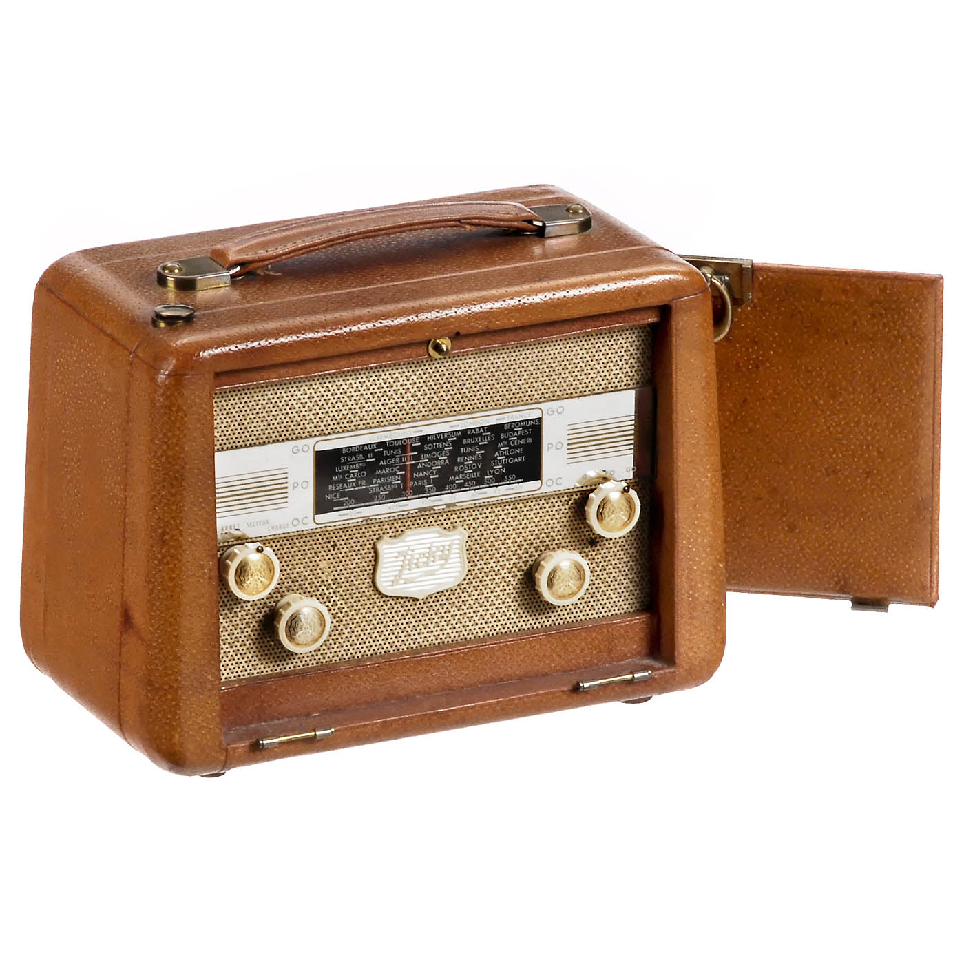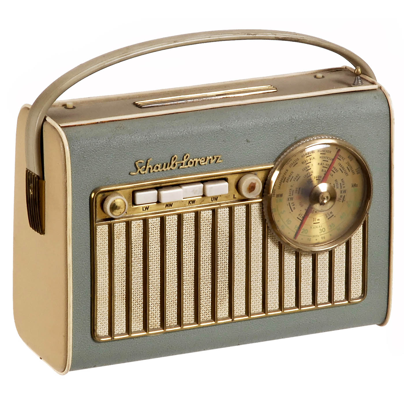 1) Telefunken Kavalier, c. 1959, 7 tubes, LW, MW and VHF, mains or battery operation, with 2 band antennae. – 2) Zenith Trans-Oceanic H500, c. 1952, USA, 5 tubes, MW and SW, mains or battery operation, cover loose on right side, with antenna. – 3) Metz Babyphone S, c. 1955, 4 tubes, radio with record player, mains or battery operation, bakelite case, with tape antenna. – 4) Jicky Traveller, c. 1953, Arco Jicky, Le Matériel Radioélectrique, France, 7 tubes, 3 wavebands, mains or battery operation, with antenna. – 5) Philips LX 422, c. 1952, Netherlands, 5 tubes, 3 wavebands, mains or battery operation, bakelite case. – 6) Schaub-Lorenz Weekend 57U, c. 1957, 6 tubes, 4 wavebands, mains or battery operation, with antenna. – And: 7) Philips Mignon AG 2100D-75, c. 1959, Philips Germany, record player, 45 rpm, 220 volts AC, plastic case.