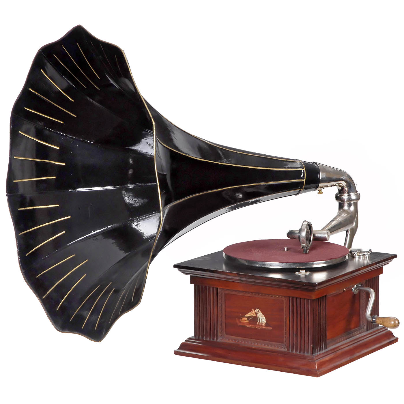 His Master’s Voice. Mahogany case with HMV decal, HMV No. 2 reproducer, double-spring motor, large 11-panel metal horn (repainted), Ø 24 in., good playing condition.