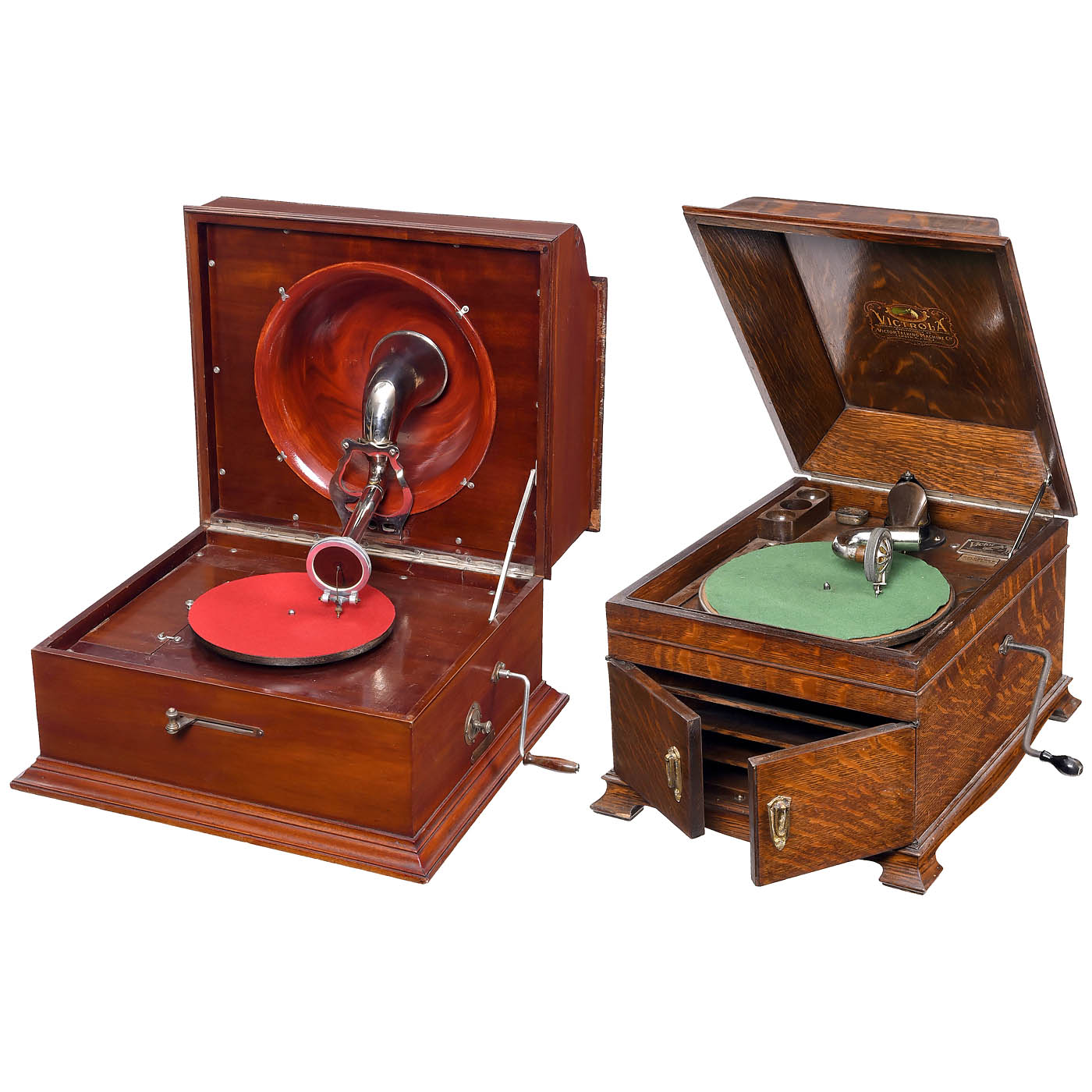 1) Pathéphone Reflex No. 21, c. 1914, Pathé, Paris, for vertically-cut records, reflex horn in lid, Pathé reproducer with sapphire, walnut case, left side with compartment for pick-up arm and crank, excellent playing condition. – And: 2) Victrola VV-IX, 1923, no. 547878, oak case, double-spring motor, soundbox replaced, speed regulator in need of adjustment, otherwise working.