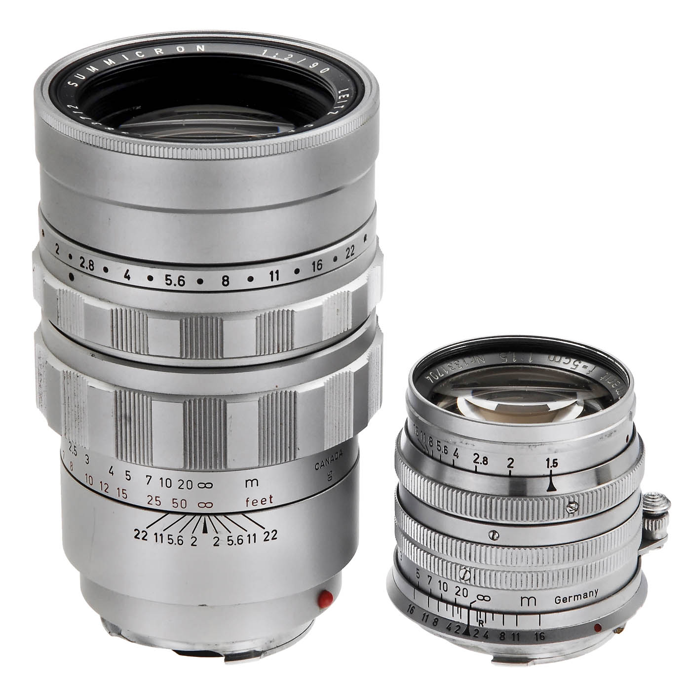 Leitz, Wetzlar/Canada. 1) Summarit 1.5/5 cm, no. 1331704, c. 1955, with front and rear lens caps, inner rear element with a thick fog under point light, otherwise very good condition. (2–3/3) – And: 2) Summicron 2/90 mm, no. 1983712, chrome, c. 1963, with front and rear lens caps, both aperture surfaces with light fog under point light. (3/3)