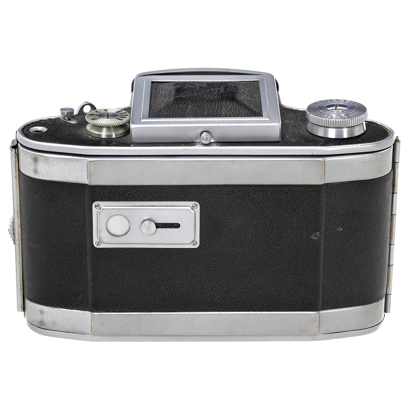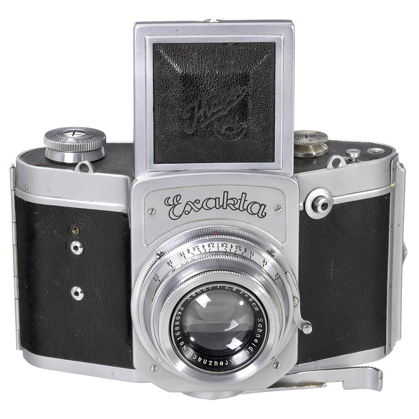 Ihagee, Dresden. No. 554203, 6 x 6 cm, with focal plane shutter 1/1000 sec., rapid-wind lever, Schneider Xenar 2,8/8 cm no. 1688092, glass clean, mirror near-mint, focusing screen missing. Rare and sought-after single-lens reflex camera.