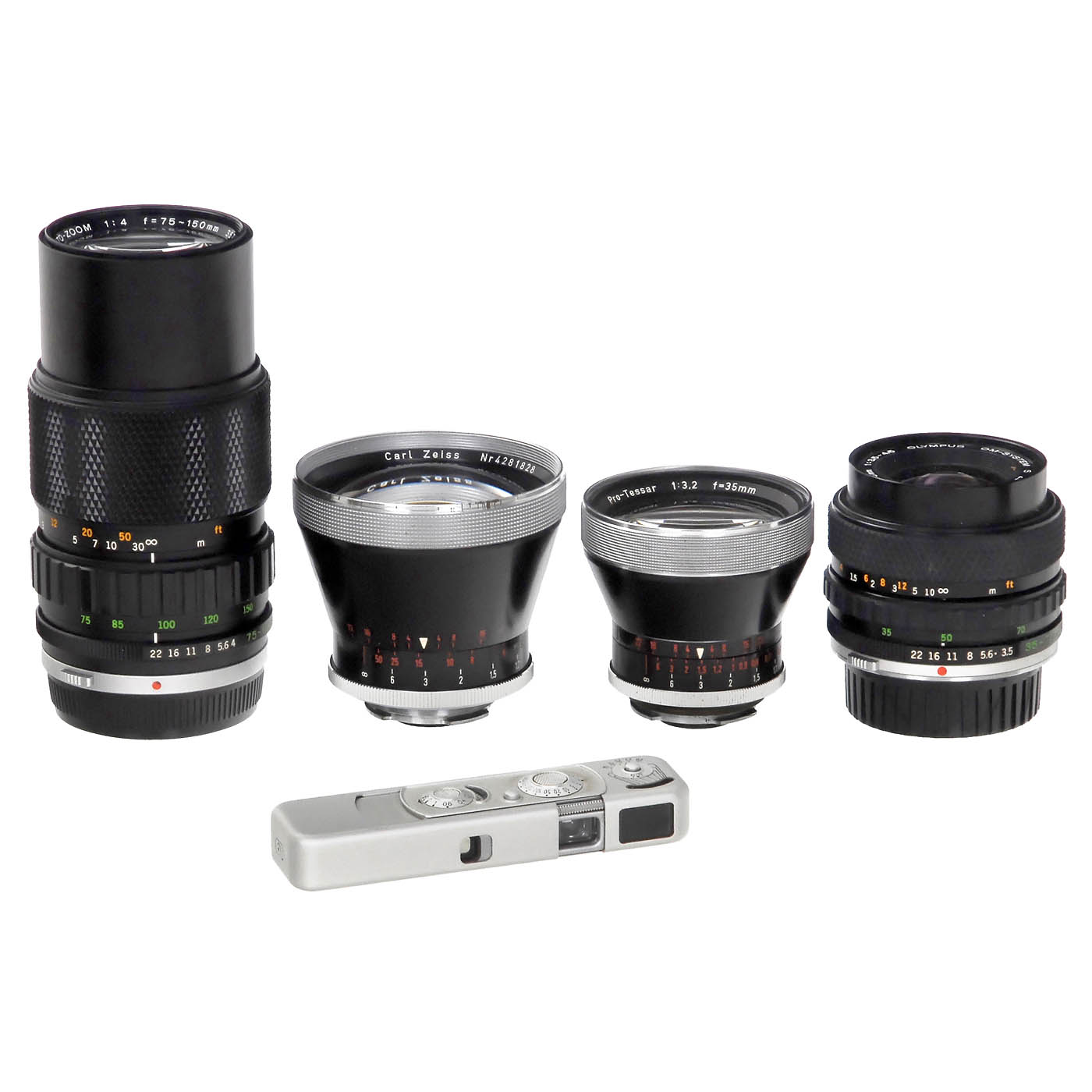 1) Olympus OM-1 with Zuiko 1,4/50 mm. (3/3) – 2) Olympus Zuiko 3,5–4,5/35–70 mm. (2/2) – 3) Olympus Zuiko 4/75–150 mm, with case. (3+/3) – 4) Zeiss Ikon Contaflex super B with Tessar 2.8/50 mm, with case 23.1201 and Pro-Tessar 3,2/35 mm and Pro-Tessar 4/115 mm. (2–3/3) – 5) Contessa-35, no. T 96998. (3-/3) – 6) Nettar 217/16. (3+/3+) – 7) Voigtländer Vito CL, exposure meter works. (3/3) – 8) Vito CD, exposure meter works. (2-/3) – 9) Vito BL. (3/3) – 10) Kodak Retina III c, Xenon 2/50 mm, exposure meter and rangefinder working, release button stiff. (3/3) – And: 11) Minox B with chain and case. (3/3)