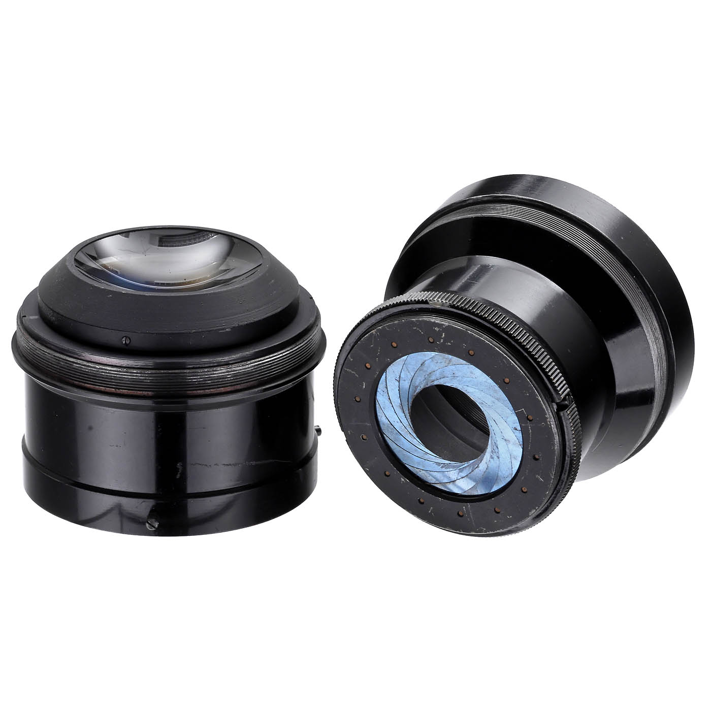 GOI Government Optical Institute, USSR. No. 4247, an unusual, extremely compact lens design (design with features of the Bertele Sonnar), the last lens element is strongly concave, after this lens follows the iris diaphragm in a distance of approx. 37 mm. The construction of the lens offered here bears a similarity to that of the FS-2 rifle camera with GOI lens. The optic illuminates more than 9 x 12 cm and the sharp image circle without zone and coma errors is approx. 48 mm Ø. (The assessment took place at night at a distance of 5 km from high-rise buildings on the horizon). Outstanding 24 x 36 mm image quality for an uncoated lens!