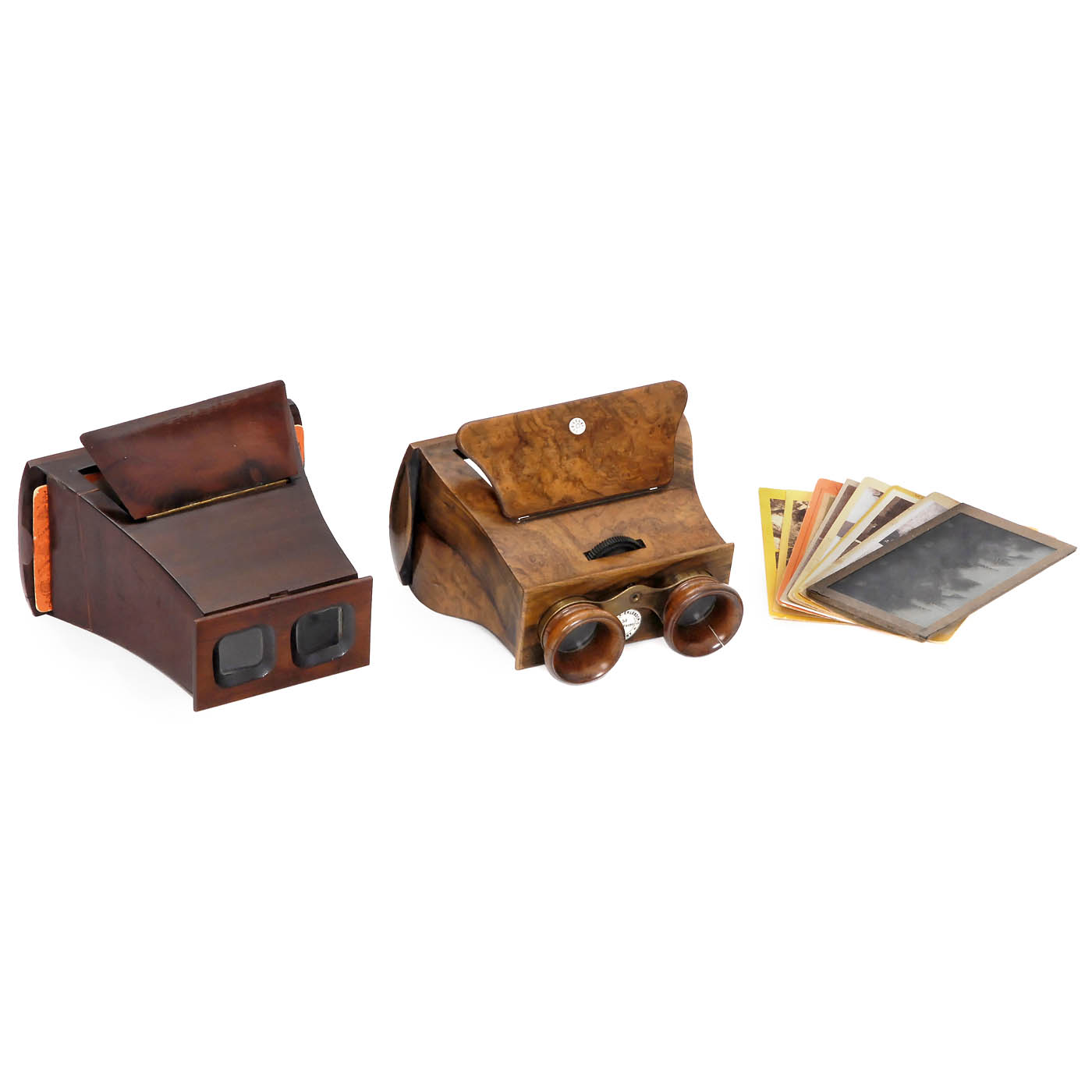 1) London Stereoscopic Company. Deluxe stereo viewer for 9 x 18 cm slides and cards, burr-wood veneer, missing focusing device and small section of wood on the rear, otherwise in good condition. With colored slide "Departure of Troops" in Japan, c. 1904, cracks, rare. (3/–) – 2) Early prism handheld viewer for 9 x 18 cm slides and cards, with folding front and 8 early American stereo cards. (3-/3) – 3–6) 4 Brewster handheld viewers for stereo cards of 9 x 18 cm, including Underwood and The "Saturn" Scope. (3/3) – 7) Roses Optik, Stockholm Uppsala. Metal stereoscope. (3-/3) – 8) Underwood stereo cards, 39 genre scenes, 32 of America, 14 of Italy, 15 of Scandinavia and 52 from around the world, usual condition for their age. – And: 9–11) 3 Viewmaster viewers and a box of 40 Viewmaster discs and leaflets.
