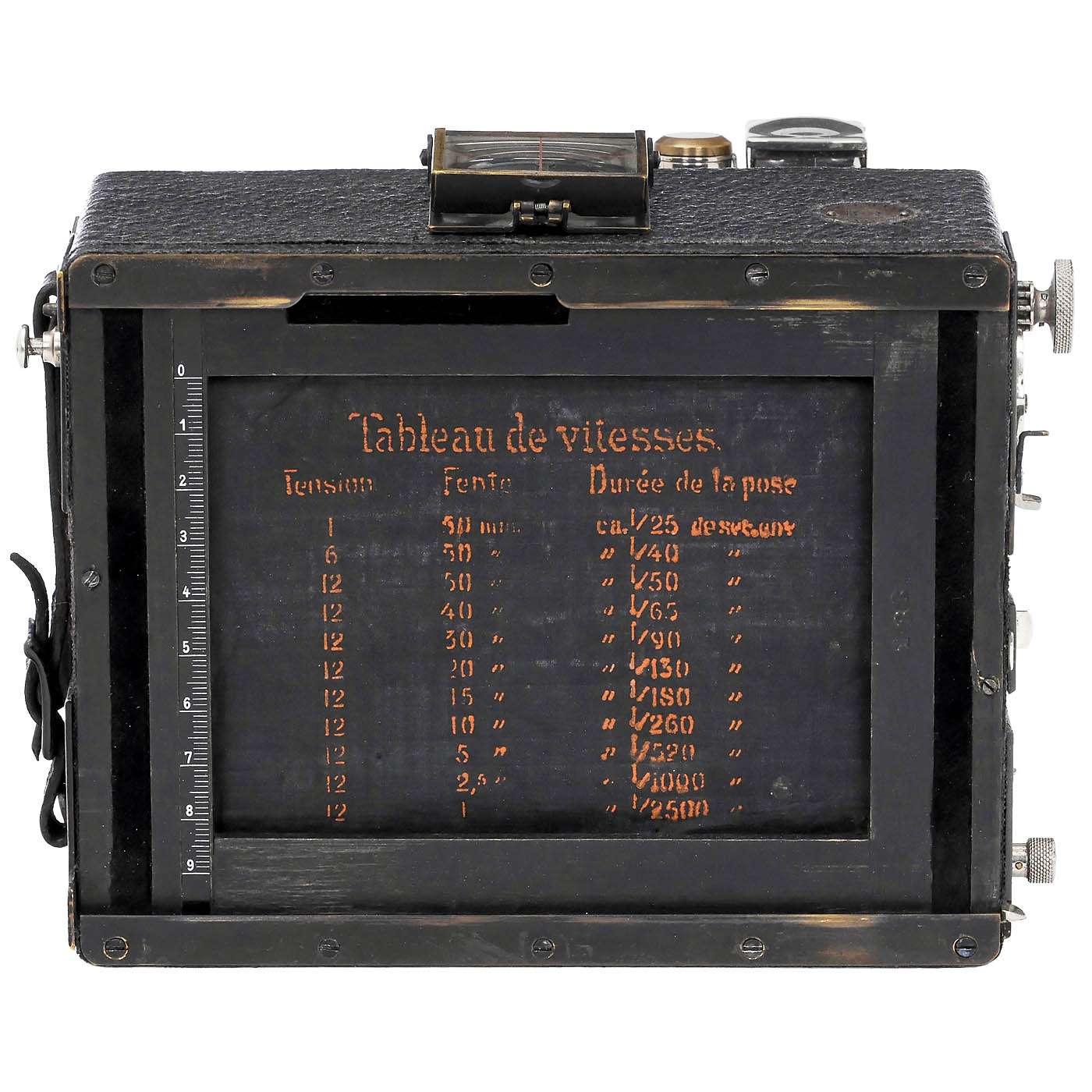 1) Ernemann, Paris. Heag VI, for 9 x 12 cm plates, aluminum camera front, wine-red bellows, focal plane shutter with French inscription, with Ernemann Double-Anastigmat 5.4/135 mm no. 11485, Bob Mod. 1 shutter, focusing screen back for thin Hemera cassettes, with eject lever, shutter working. Desirable, technically refined camera! – And: 2) Ernemann, Dresden. Heag III, for 9 x 12 cm plates, wine-red bellows, changeable Ernemann Detectiv Aplanat 6.8/No. 1, no. 88370 in Bob Mod. II shutter, works, focusing screen back with additional flap.