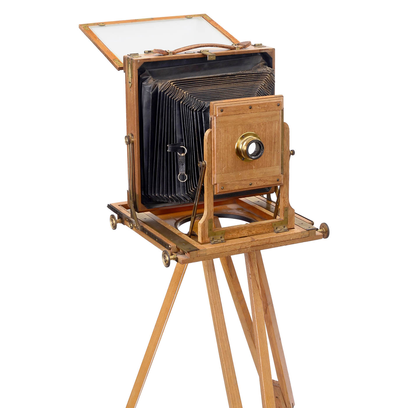 Germany, 18 x 24 cm, similar to the ICA Perfect for double extension, light-colored wood with tripod of the same tone, rotatable tripod collar with lock built into the camera, interchangeable lens plate with Meyer wide-angle Aristostigmat 9/160 mm no. 402775 and 2 double cassettes, bellows stiff in two of the top folds and presumably no longer light-proof, camera in otherwise good condition.