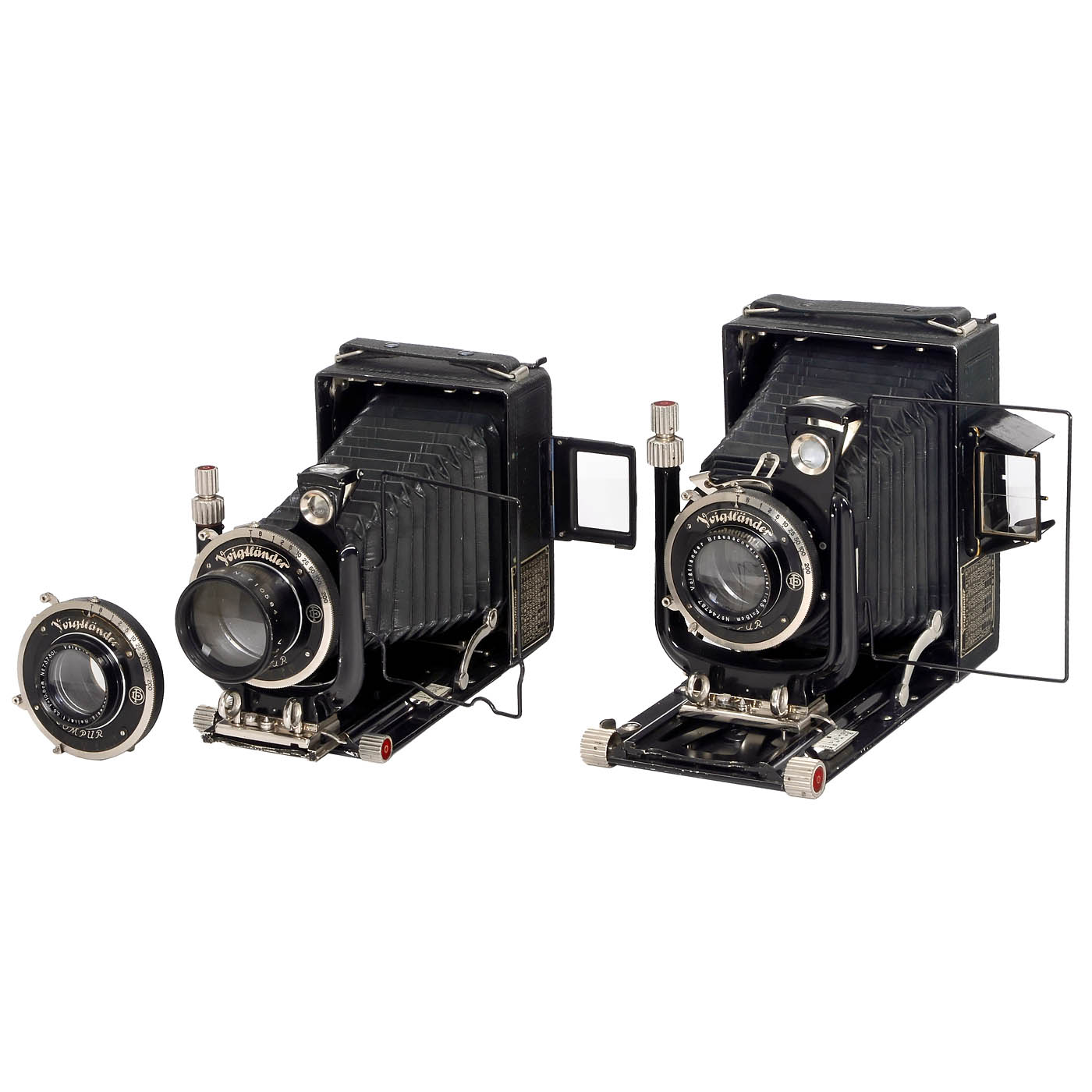 Voigtländer, Brunswick, Germany. Green leather covering and green bellows, matching leather-covered focusing screen back and original case with 3 cassettes, both cameras fully functional. 1) Bergheil 6.5 x 9 cm, Heliar 3.5/10.5 cm no. 737301 and matching Tele-Dynar 6.3/25.5 cm no. 710584 with leather case. – And: 2) Bergheil 9 x 12 cm, Heliar 4.5/15 cm no. 744787, with green packing film cassette. – Note: Thanks to three identical shutter sizes, the Tele-Dynar can be used for 9 x 12 cm images by exchanging the lenses of the Heliar 15 cm. Likewise, the Heliar 15 cm can be used for 6.5 x 9 images on the Heliar 10.5 cm by exchanging lenses. Well thought out equipment in excellent condition!