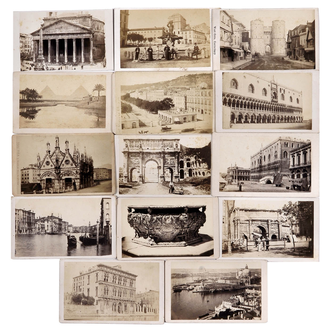 1–4) Cartes de visite of Garibaldi, his friend Candido Augusto Vecchi (1814–1869), Queen Victoria and her Prince Consort, and General Bazain. – 5–25) Cartes de visite of views, mostly Italy, photographs by Ponti, Sommer and Noack among others. – 26) Albumen image, 9.5 x 13.5 cm, of the Sphinx. – And: 27) Albumen print on card, 9 x 15 cm, "Tzar Kolokol La Reine des Cloches".