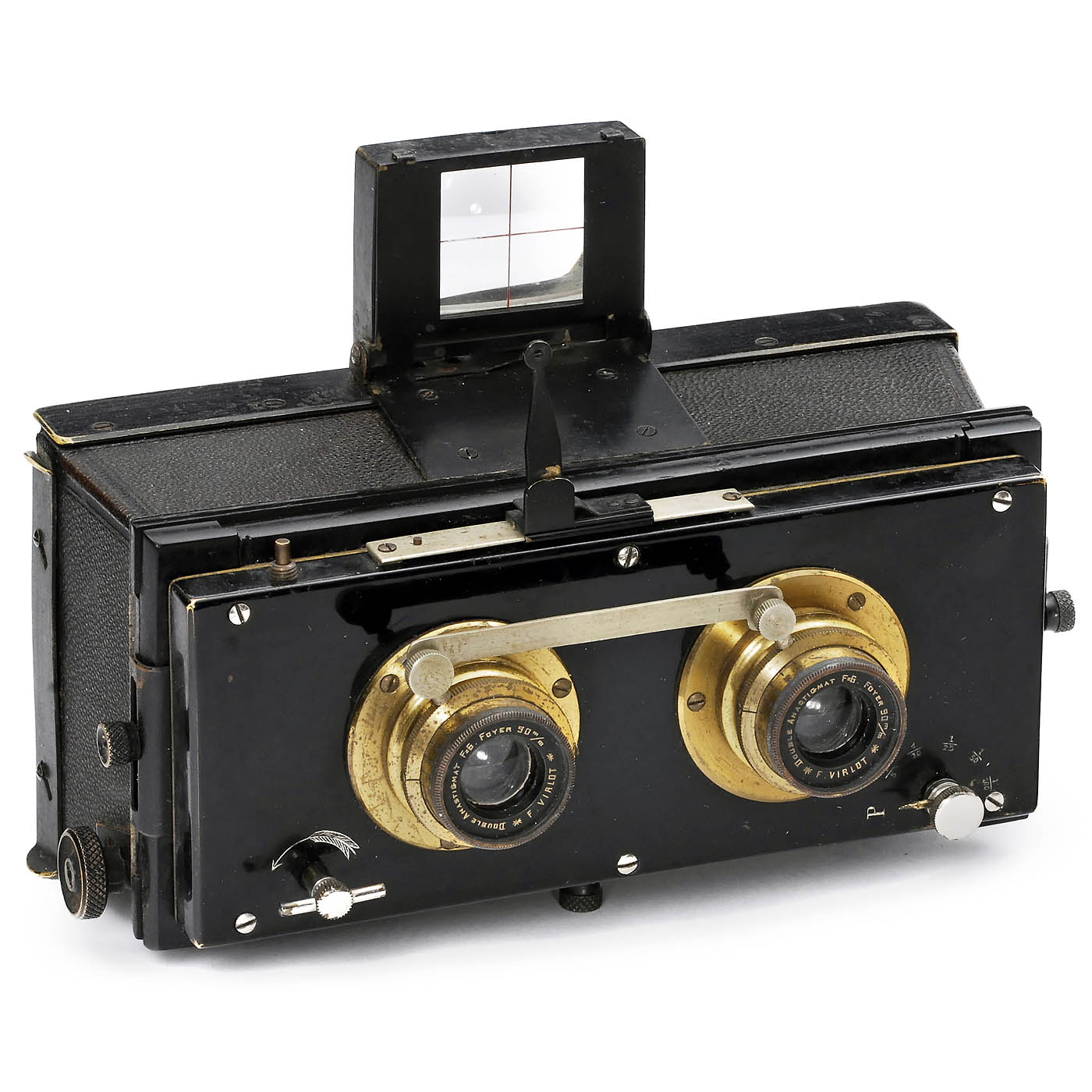G. Fournier, Paris. Stereo camera for plates of 6 x 13 cm, image size 6 x 6 cm, with F. Virlot Double Anastigmat 6/90 mm lenses, guillotine shutter P, 1/5-1/100 sec., iris diaphragms 6 to 36, focusing 1 m to infinity, Newton viewfinder and focusing screen back, shutter works on short times. - Note: Panorama pictures are taken by shifting one lens into the center while the septum moves aside automatically. - Literature: Werner Weiser, "More Stereo Cameras using Film", p. 235.
