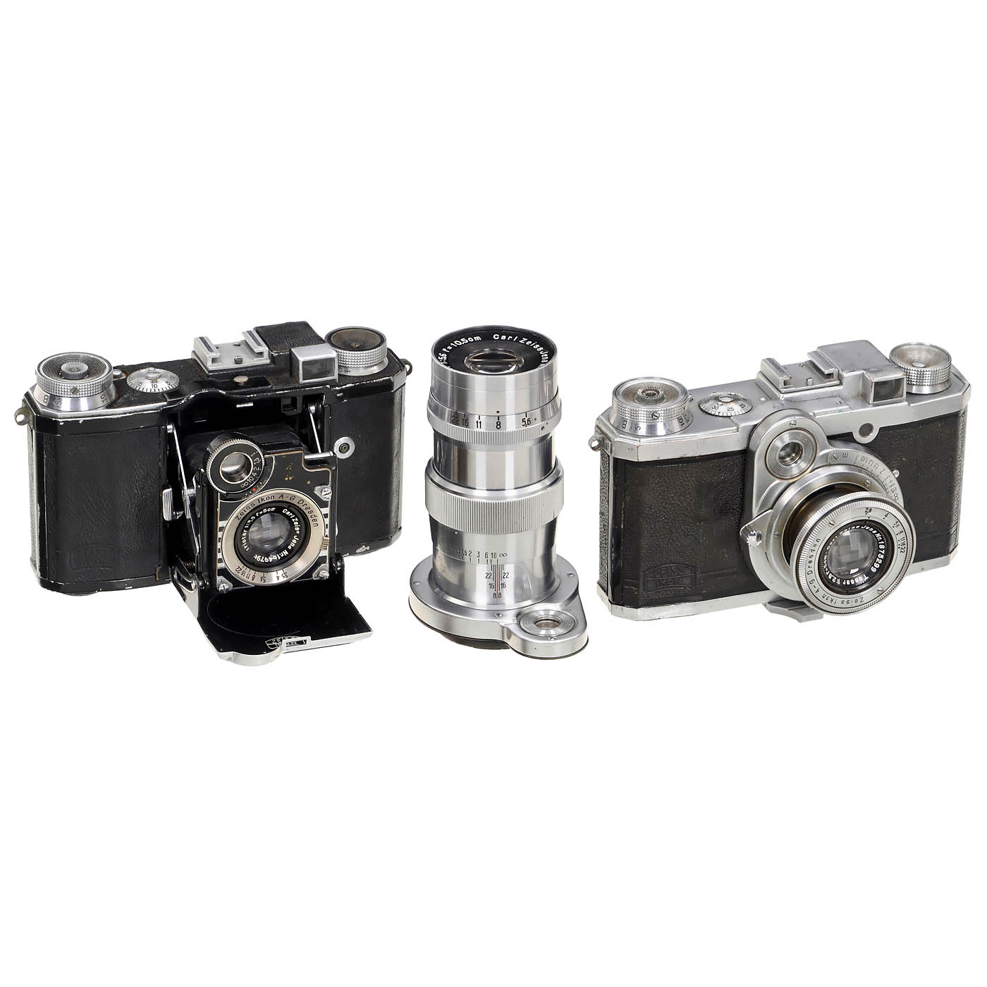 Zeiss Ikon, Dresden. 1) Triotar 5.6/10.5 cm no. 1799593, Nettax mount, interior optics with some fog, otherwise very good condition. (2-/3) - 2) Tessar 2.8/5 cm no. 1873299, Nettax mount, interior optics with some fog, otherwise good condition. (3/3) - 3) Nettax, no. B 30414, rangefinder precise, shutter inoperative. (4/-) - And: 4) Super Nettel, no. F 47273, rangefinder precise, shutter inoperative, with Triotar 3.5/5 cm no. 1649796, synchronised. (3-4/-)