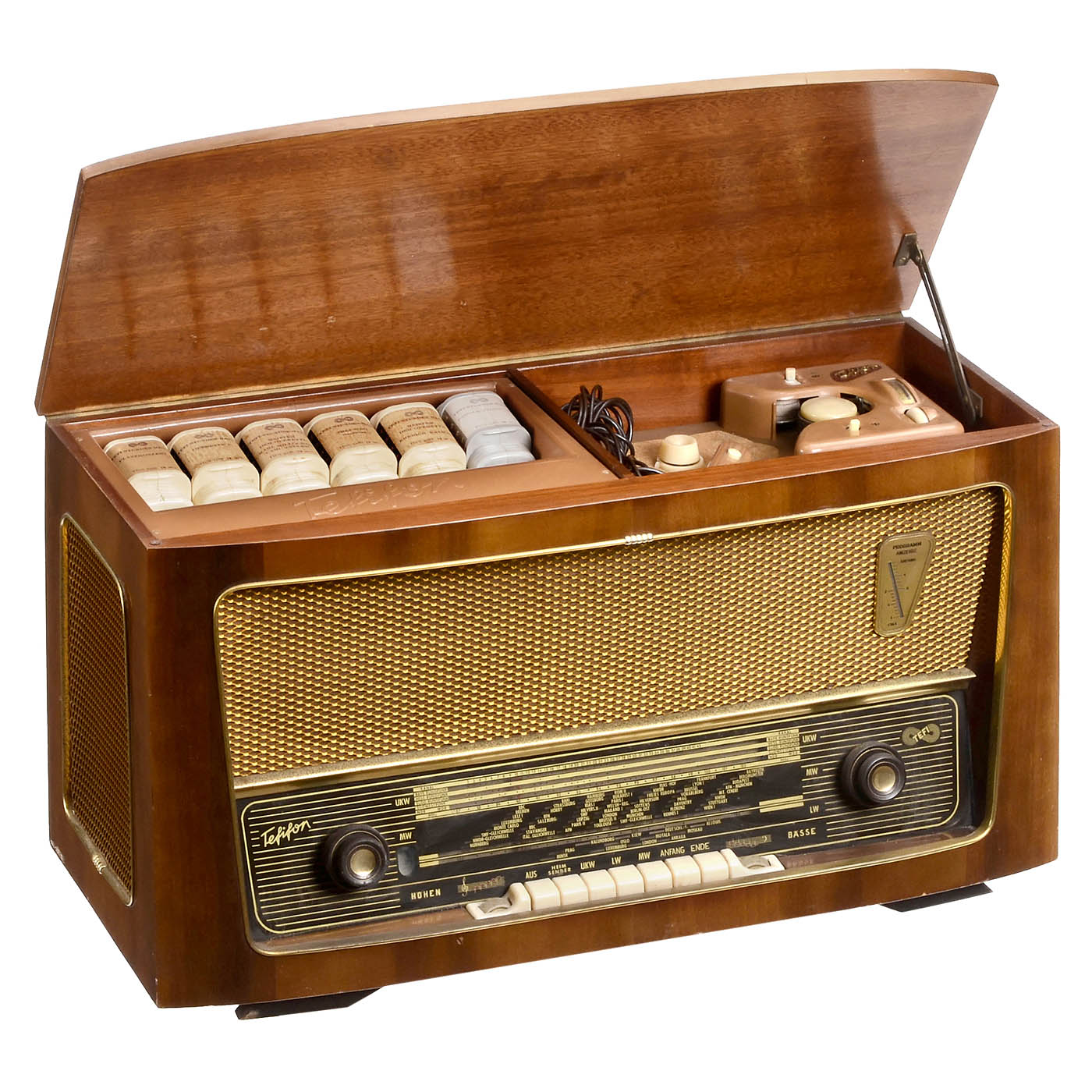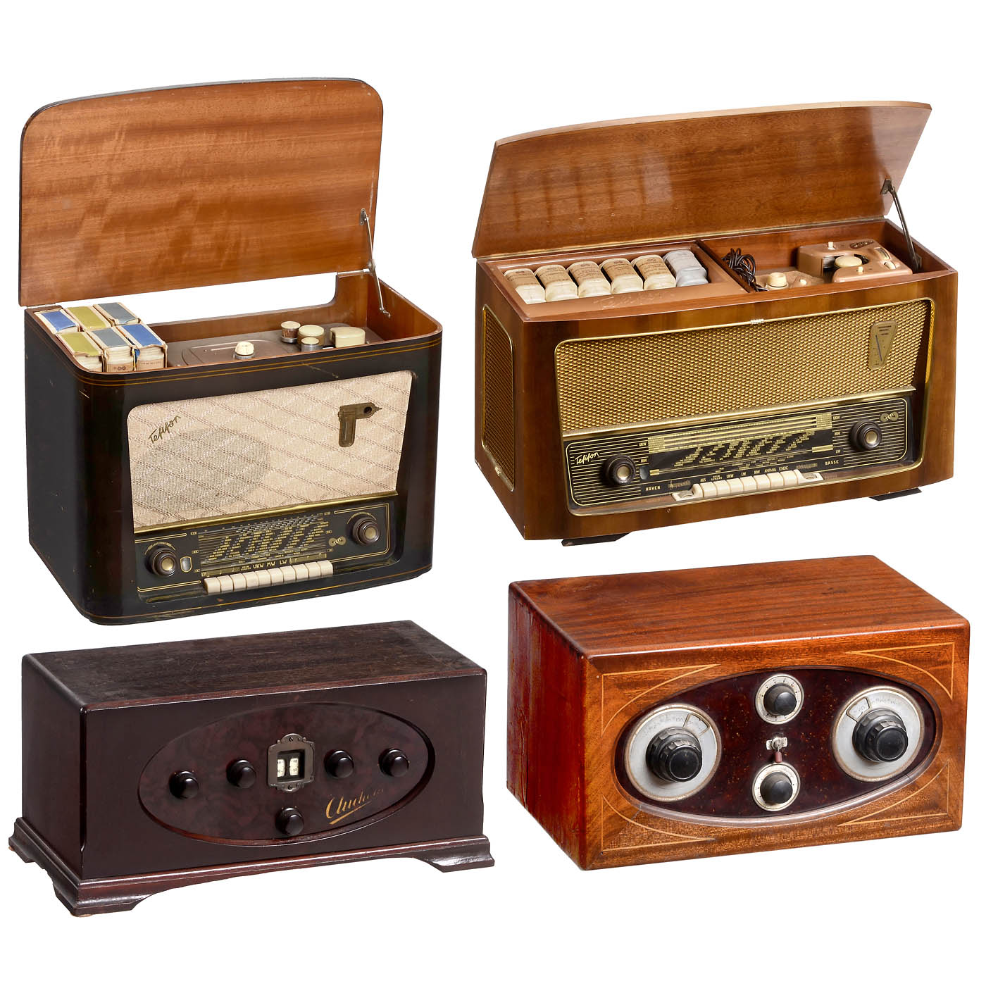 1) Tefifon radio receiver with sound tape player model 540, c. 1954, Tefi-Apparatebau, Porz near Cologne, 110-240 V AC, 3 wavebands, complete with tubes and rear panel, with 6 sound tapes. - 2) Tefifon broadcast receiver with sound tape player model T573, c. 1956, 3 wavebands, 7 tubes, wood case, tape player HS19, 4 loudspeakers, with tubes and rear panel, with 6 tapes. - 3) Maxwell type 193, c. 1940, France, 4 tubes, mains operation, complete with tubes and rear panel. - And: 4) Audiola SV3, c. 1940, Denmark, 4 tubes (complete).