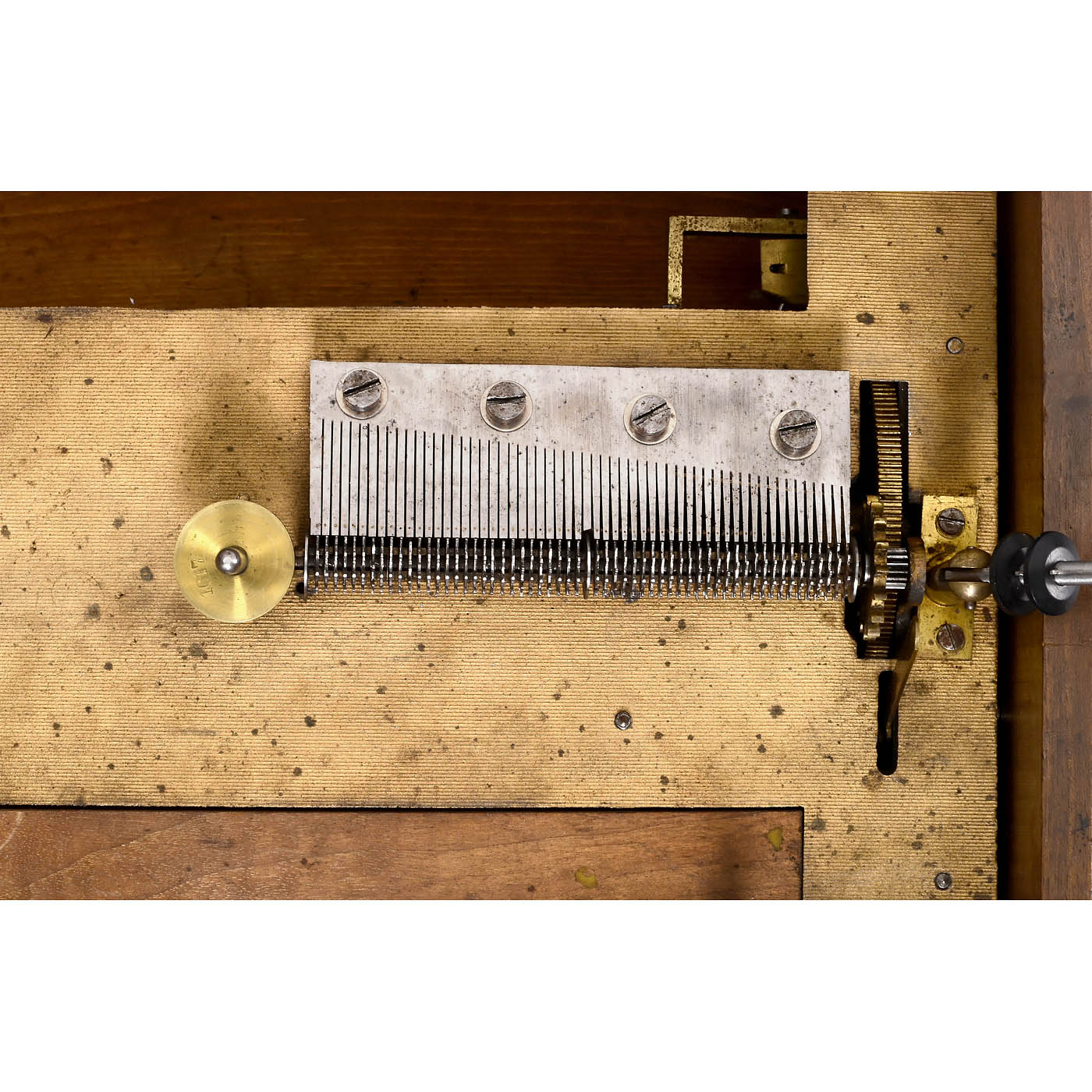 Troubadour Musikwerke B. Grosz & Co., Leipzig. For 16-inch discs, 58 teeth in steel comb (complete), spring-driven, walnut case with original lithograph in lid, missing 1 inner cover, no crank, case with some wormholes, slight damage to the veneer, good playing condition, with 4 old and 5 new discs.