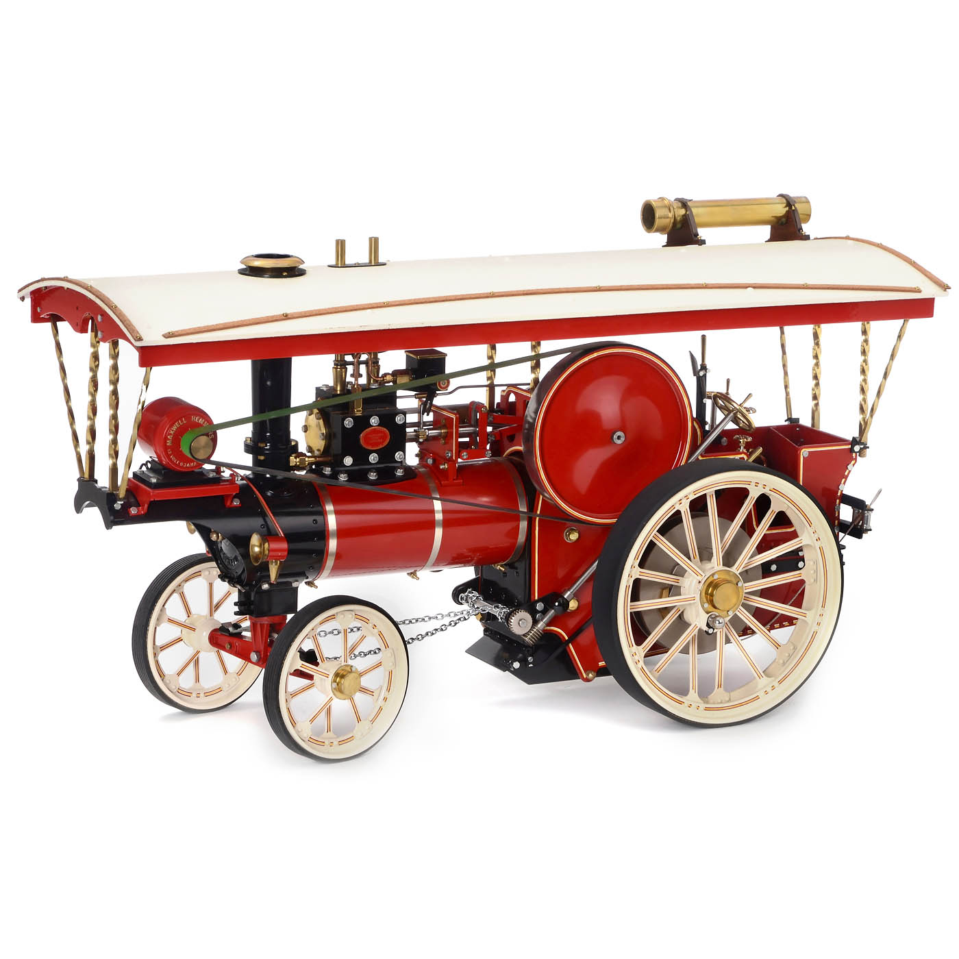 Maxwell Hemmens, Engineers, Thorganby, York. Reversible, 2 gears, steerable front axle with chains, parking brake, manometer, electric lighting, rope winch, full-length canopy, extension chimney, fixed cylinder Ø 1 1/4 in., boiler Ø 2 3/4 in., flywheel Ø 4 1/2 in., overall size: 21 7/8 x 7 7/8 x 15 3/4 in., complete with all fittings. In near-mint, unfired condition. A fascinating model of first-class engineering quality.