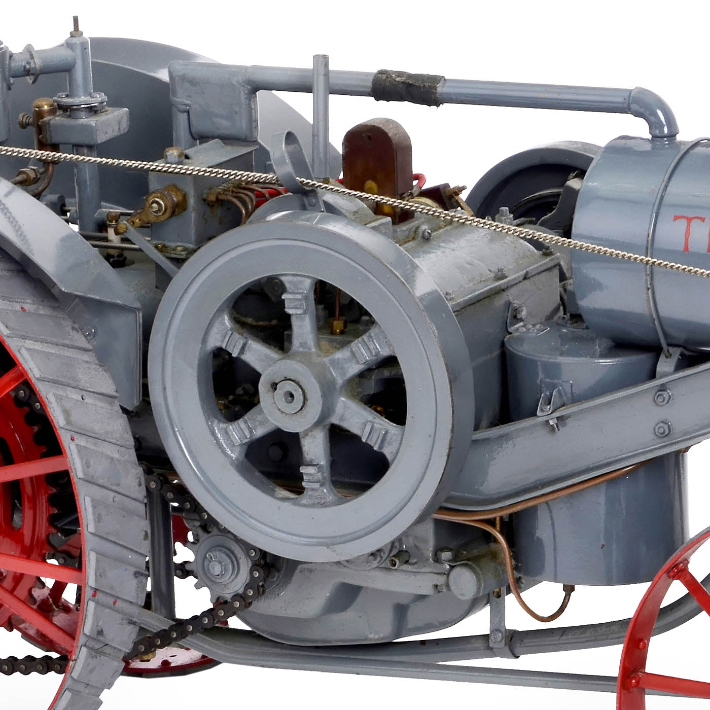Based on the American original, manufactured by the International Harvester Company between 1915 and 1923, metal model, finished in grey with red spokes, water-cooled 2-cylinder kerosene engine, 2 forward gears, 1 reverse gear, power transmission with 2 chains to the rear wheels, spoked steel wheels, Ø front 6 in., Ø rear 9 ¼ in., eccentrically-driven oil pump, paraffin tank, water tank, length 23 in., width 9 ½ in., with disc plough attached to the front axle, very good condition, untested.