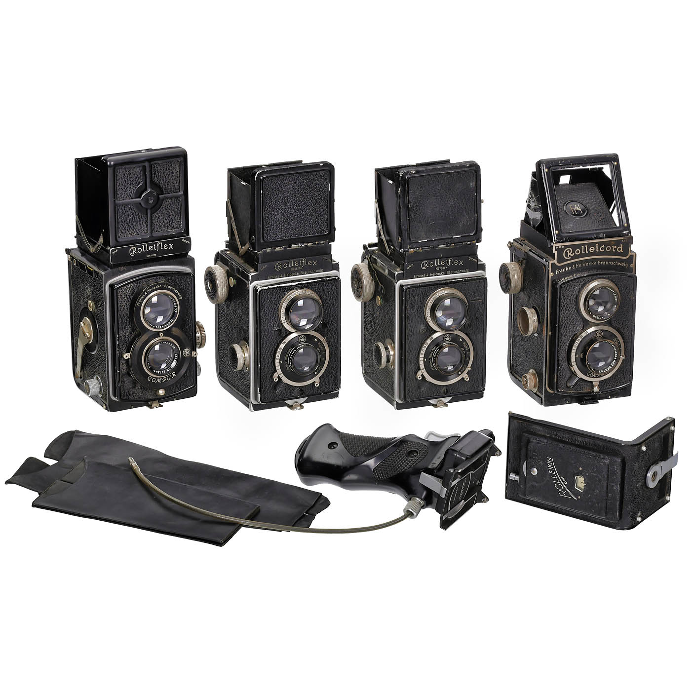Franke & Heidecke, Brunswick. 1) Rolleiflex, first model no. 43238, c. 1927, with Tessar 3.8/7.5 cm, cap and case, Compur shutter working at one speed. (3/3) - 2) Rolleiflex, first intermediate model no. 76347, 1929-30, with Tessar 3.8/7.5 cm, Compur working at one speed. (4/4) - 3) Rolleiflex Standard no. 520065, c. 1935, with Tessar 3.5/7.5 cm Compur, reverse with French retailer’s plate "Tiranty", with cap and case, shutter working. (3-/3) - 4) Rolleicord I, second model, no. 058592, c. 1936, Triotar 3.8/7.5 cm. (4/4) - And: 5) Rollei accessories, including several rare pieces, 14 various Rollei filters and Proxars, some with leather cases, Rolleinar 1 and 2 with bakelite box, Rolleiflex stereo rail, plug-in shaft (small and large), rear back for Rolleikin and Rolleikin accessories, yellow gradient filter with case, metal lens hood size I in case, pistol-grip and a large retailer’s brochure for customer demonstrations in French. (3/3)