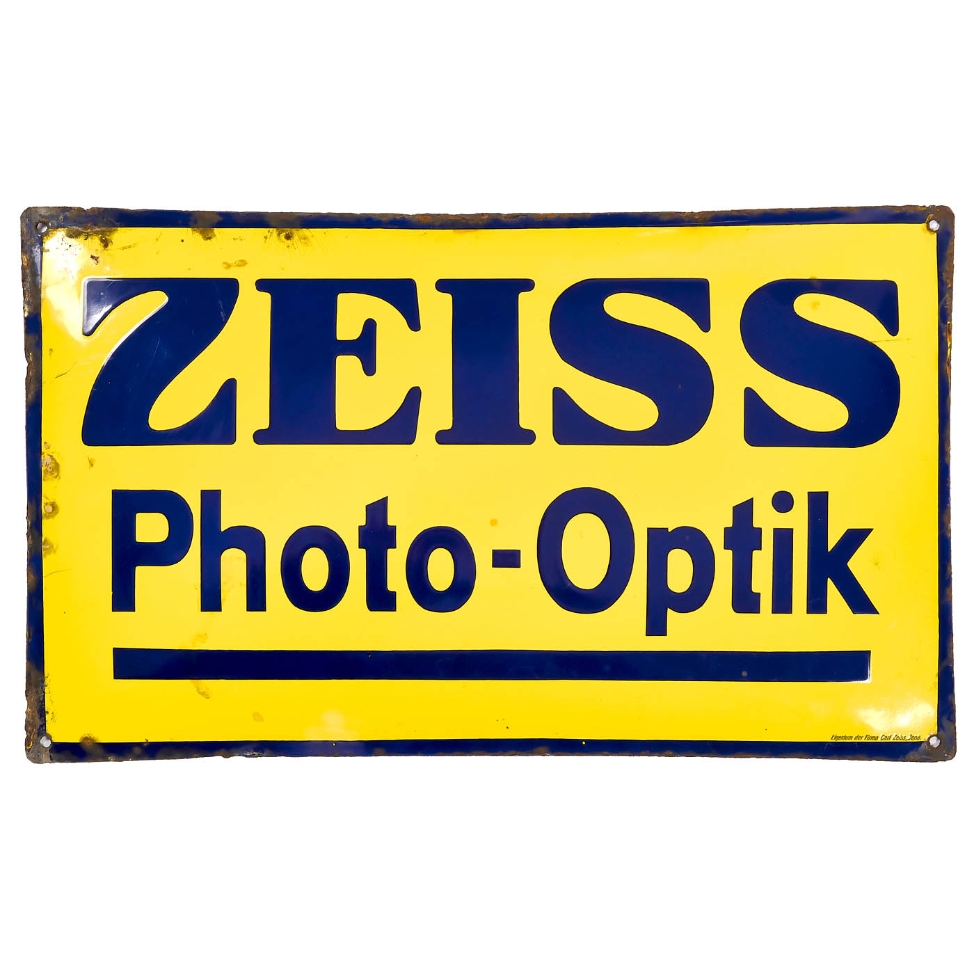 1) "ZEISS Photo-Optik", 50 x 30 cm, a mounting hole at each corner, small print: "Property of the Carl Zeiss Company, Jena", good condition seen from the front, reverse with rust. (3/-) - And: 2) Early version of the film manufacturer ADOX "Schleussner FOTO", 48-cm diameter circular format, enamel front with damage, with four mounting holes on the edge. (4/-)