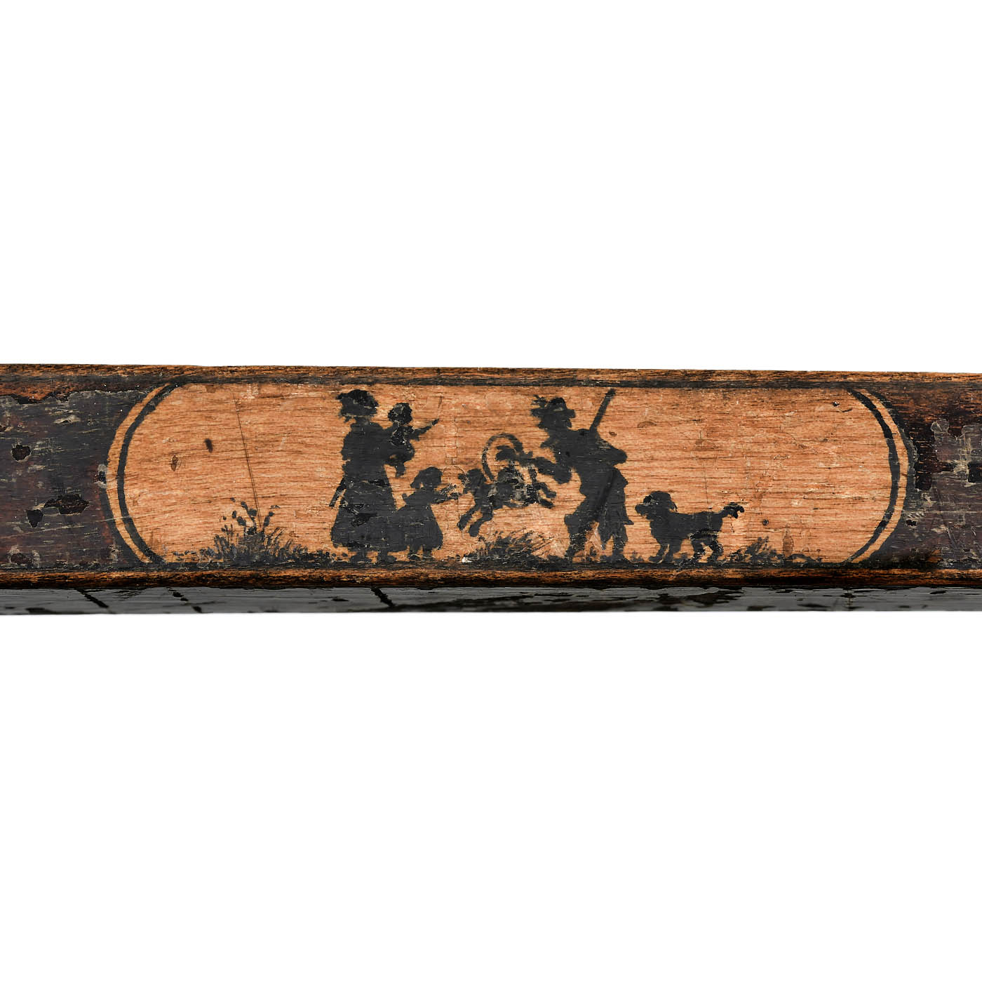 Square sticks, with turned handles on the side. 1) Various types of wood and fine inlay, calibrated in several early units of measurement, length 28 in. - And: 2) Probably lime, graduation in cm, handwritten numbers, painted floral ornaments and silhouette with playing children, length 24 4/5 in.