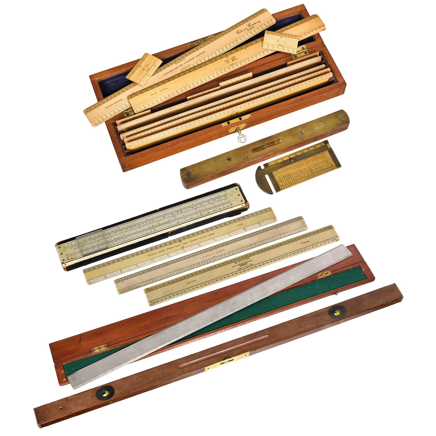 1) Nautical slide rule for weights of wire, ropes and chains, made by John Rabone & Sons, Birmingham, boxwood and brass, for Germany, various calibrations, length 4 ½ in. - 2) Spirit level, "British Make", boxwood and brass, length 10 in. - 3) Three bone scale rules, two by Stanley, London, one by Abraham, Glasgow, length 12 in. each. - 4) Large level, W. Marples & Son, Sheffield, mahogany and brass, 3 bubble levels, length 48 in. - 5) Slide rule "Universal", Albert Nestler, Germany, in card box, length 11 3/5 in. - 6) Mahogany-cased set of boxwood rules, by E.T. Newton & Son, Camborne, with 12 engine-divided scale rules, lengths 2 and 12 in. - And: 7) Large stainless steel scale rule, by B.J. Hall & Co Ltd., calibrated in meter and inches, length 40 ½ in., in mahogany case.