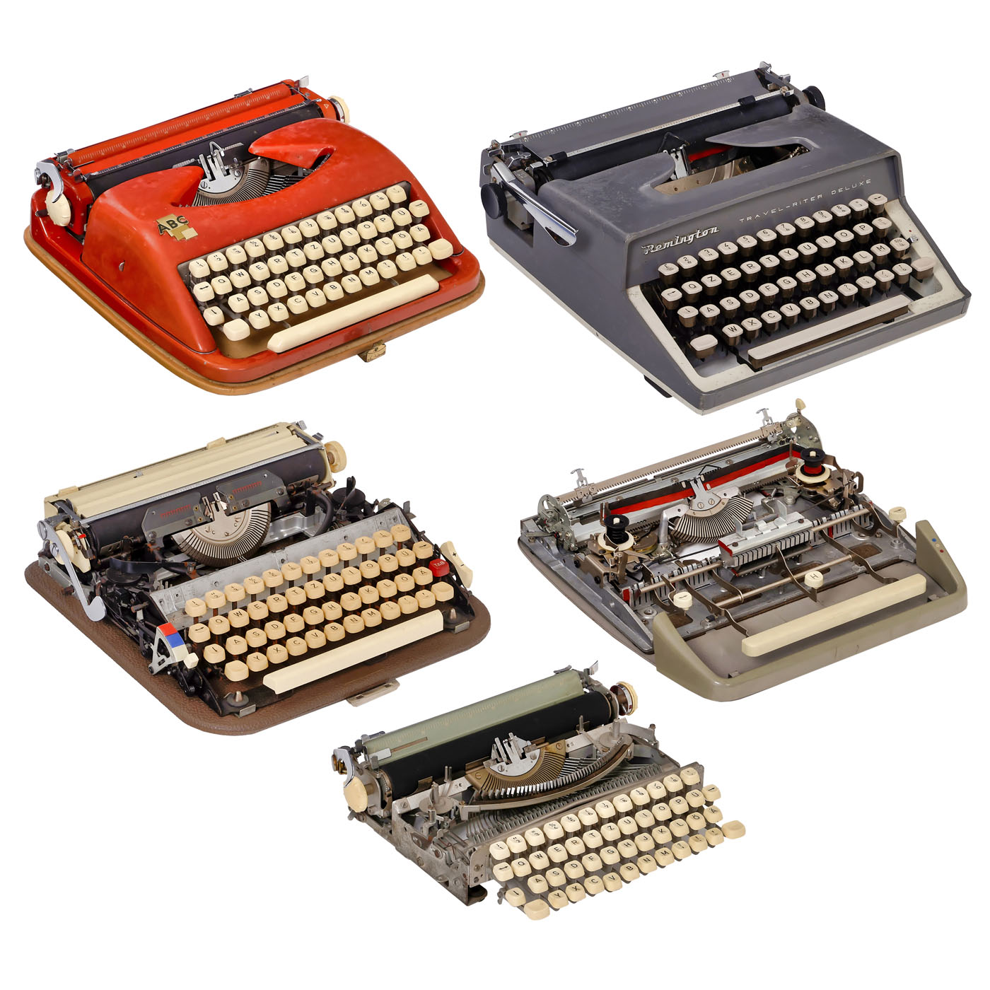 1) "Remington Travel-Riter De Luxe", c. 1958, the actual typewriter shown on the etching (1983) by writer and Nobel prize winner Günter Grass about the poet Heinrich Böll's favourite typewriter. - 2) ABC machine model, Germany, without case, working. - 3) Prinzess KSM, Germany, model with 3 typebars, in case. - 4) Gossen-Tippa, model with one key, to demonstrate the carriage train and ribbon transport, with case. - And: 5) ABC portable typewriter, Kochs Adler, Germany, design by Wilhem Wagenfeld, 1951 onwards, red housing, in case.
