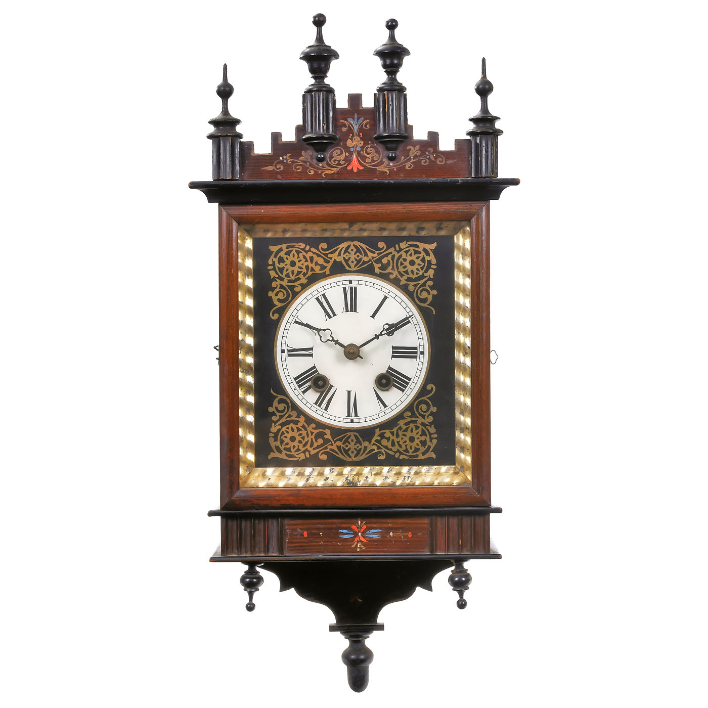 1) Biedermeier clock, c. 1860, Black Forest, enamel dial, Roman numerals, painted face with 2 porcelain half-columns, wood-plate movement, time-and-strike movement arranged side by side, half-hour strike on spiral gong, pull-string repetition, glazed pine case, with pendulum and 2 weights. - 2) Porcelain clock, c. 1870, Black Forest, enamel dial, Roman numerals, porcelain escutcheon, wood-plate movement, time-and-strike movements arranged side by side, half-hour strike on spiral gong, with pendulum and 2 pinecone weights. - 3) Picture frame clock, c. 1880, Black Forest, enamel dial, Roman numerals, face with gilt spandrels, wood-plate double-spring movement, half-hour strike on spiral gong, polished cherry wood case, complete, with pendulum. - And: 4) Viennese pendulum clock, c. 1890, two-train movement, two-part enameled dial with brass bezels, Roman numerals, subsidiary seconds dial, brass-plate movement, anchor escapement, half-hour strike on spiral gong, spring-suspended pendulum, weights with pulleys, dark-stained wood case, glazed front door, height 38 ½ in., complete with keys and weights. - All clocks working (without guarantee).