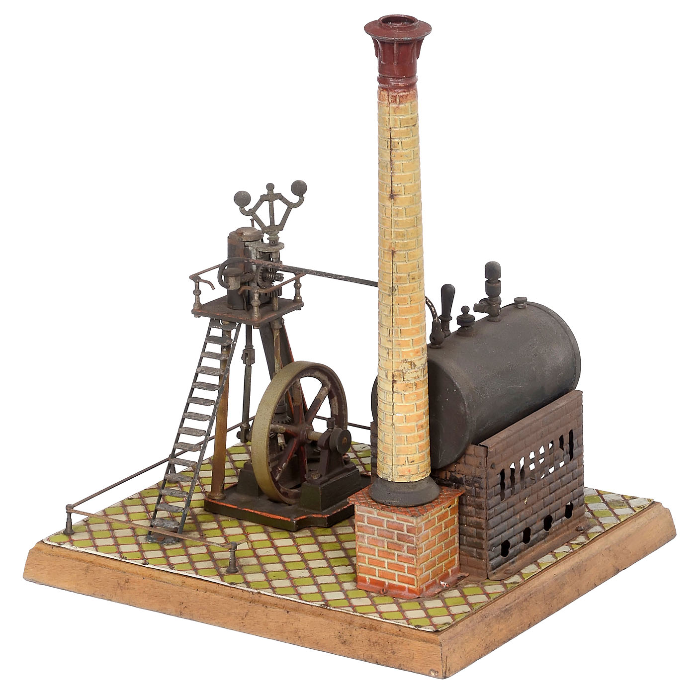 Nuremberg, no. 13931 with brass boiler, fixed cylinder, steam whistle, water-gauge glass, wood base and metal plate with simulated tiles, size 10 ½ x 9 in. - Complete with burner, in original wood crate.